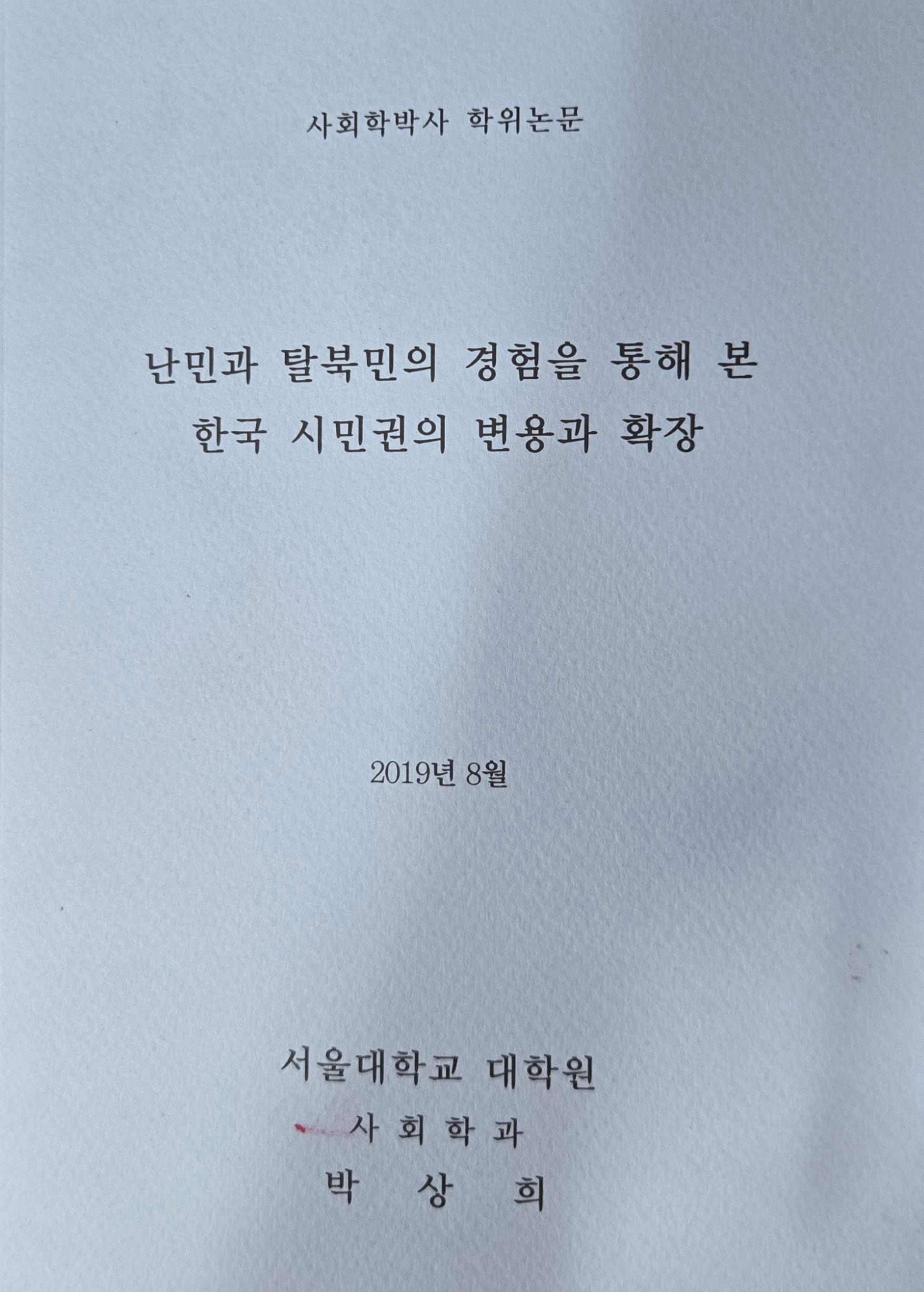 2019년 서울대학교 대학원 사회학과 박사 학위논문으로 21세기의 난민을 강제이재민(forced displaced perpons)으로 간주하여 난민과 탈북민을 함께 연구함으로써 난민개념의 구시대성 협소함을 넒히고자 했으며 난민연구에서 특수한 사례인 한국을 한국의 맥락 속에서 난민과 탈북민이 배제되는 원인을 탐구하고 있다
