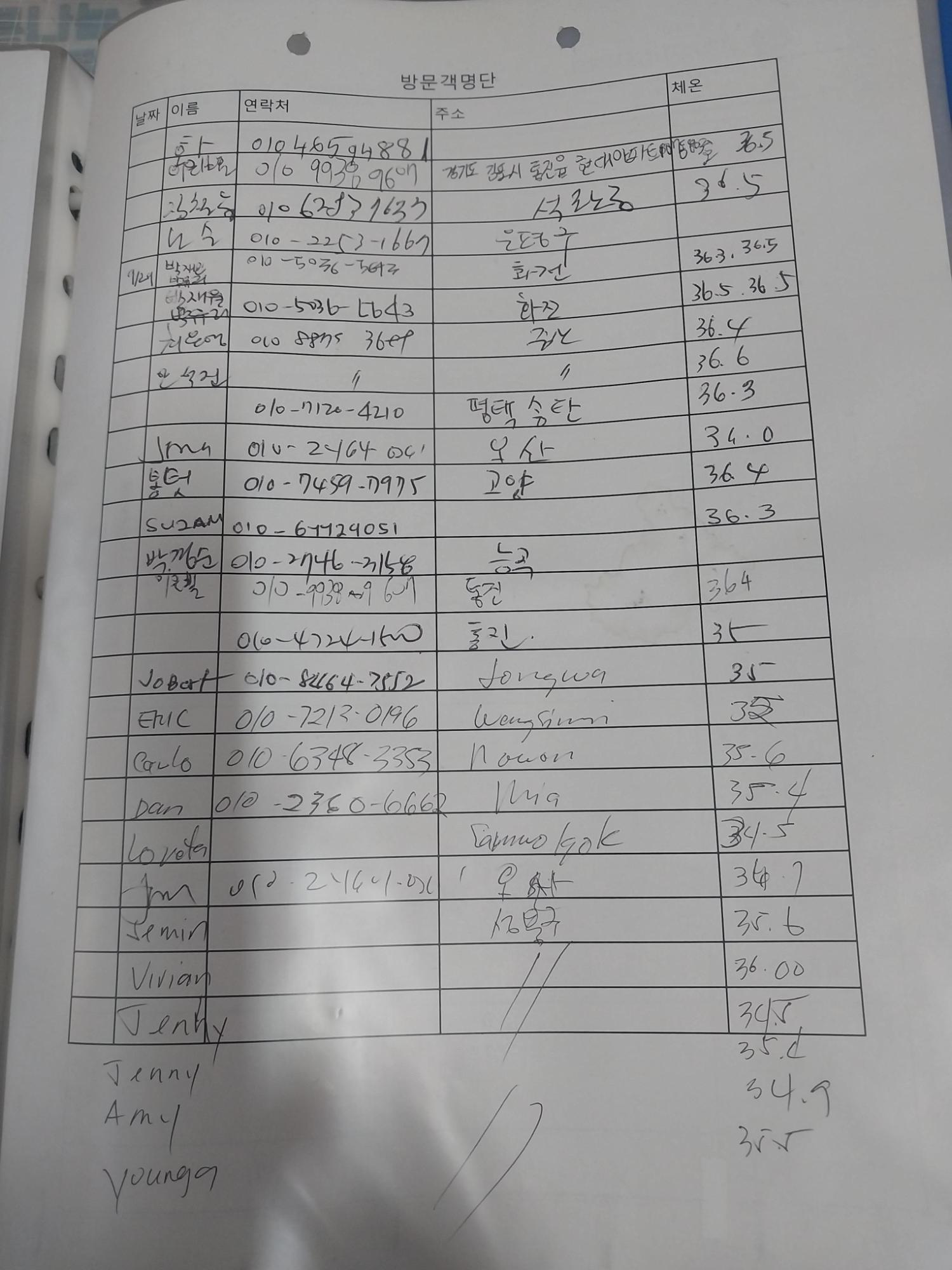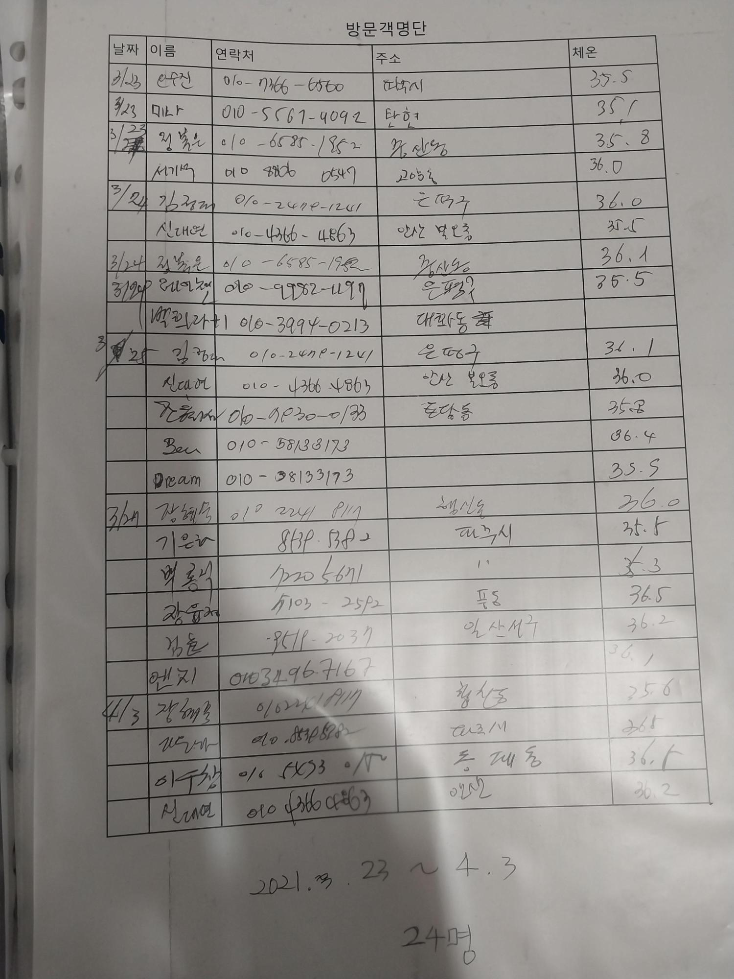 이름/ 온도체크 등의 확인 점검을 하며 대응한 사실이 기록에 남아 있음