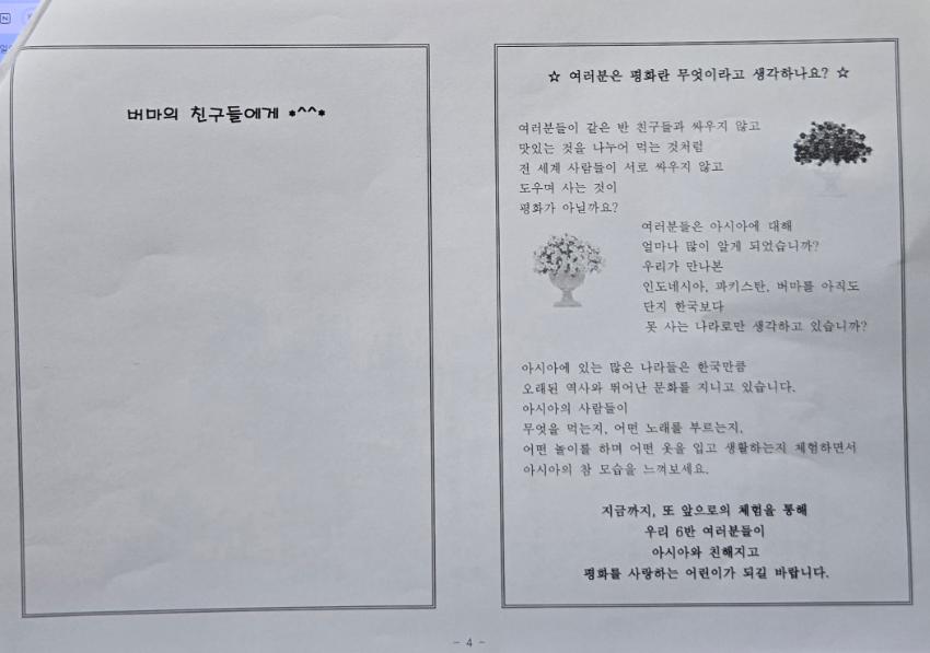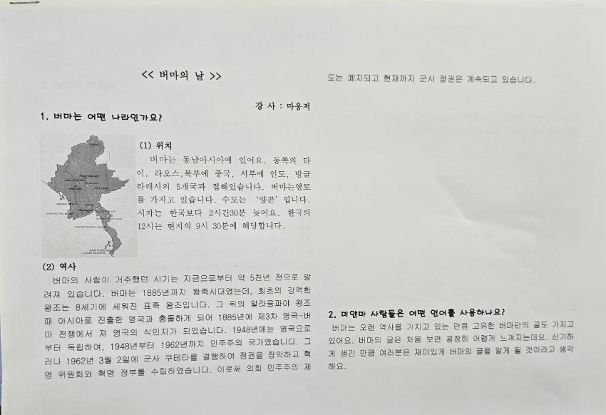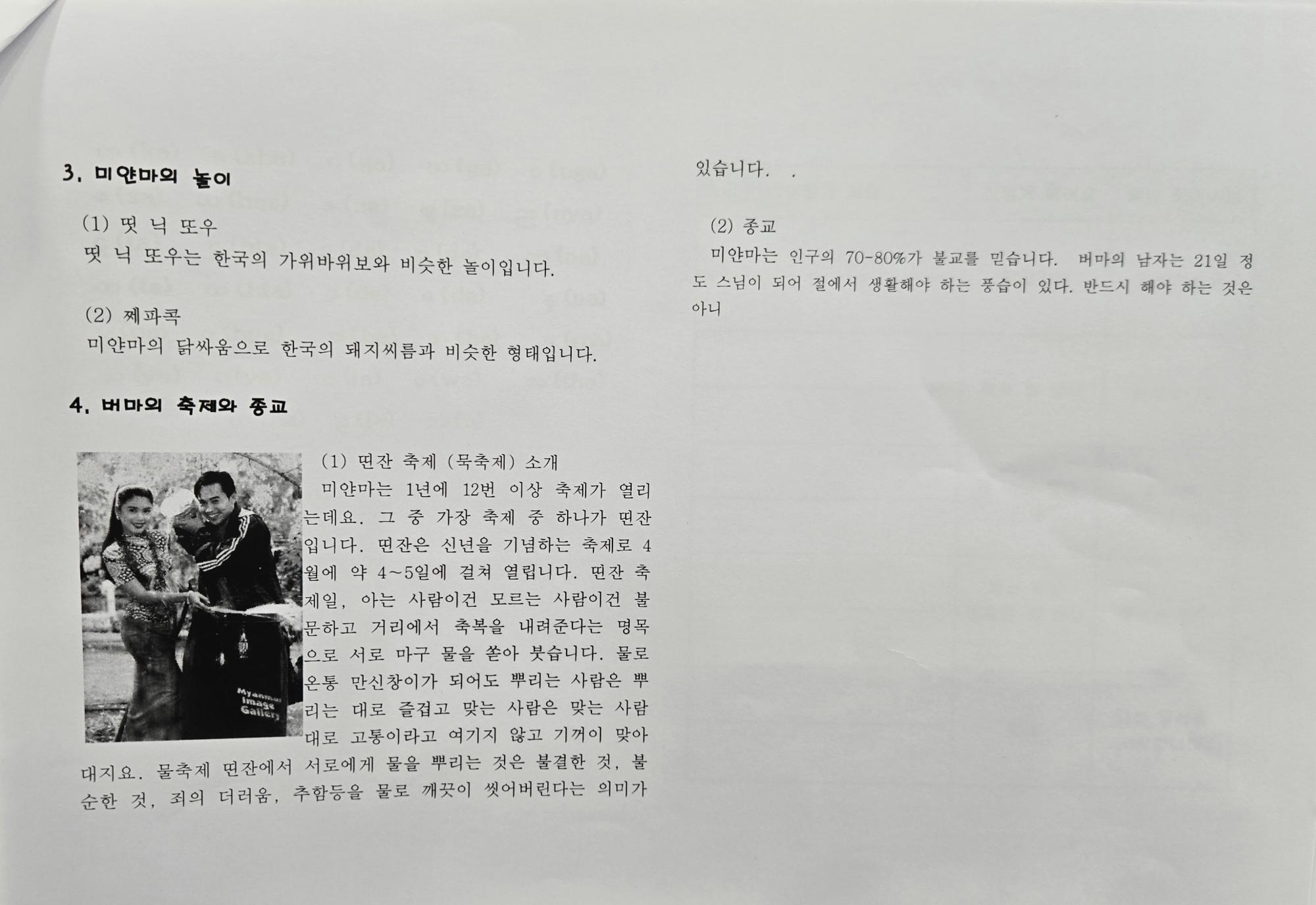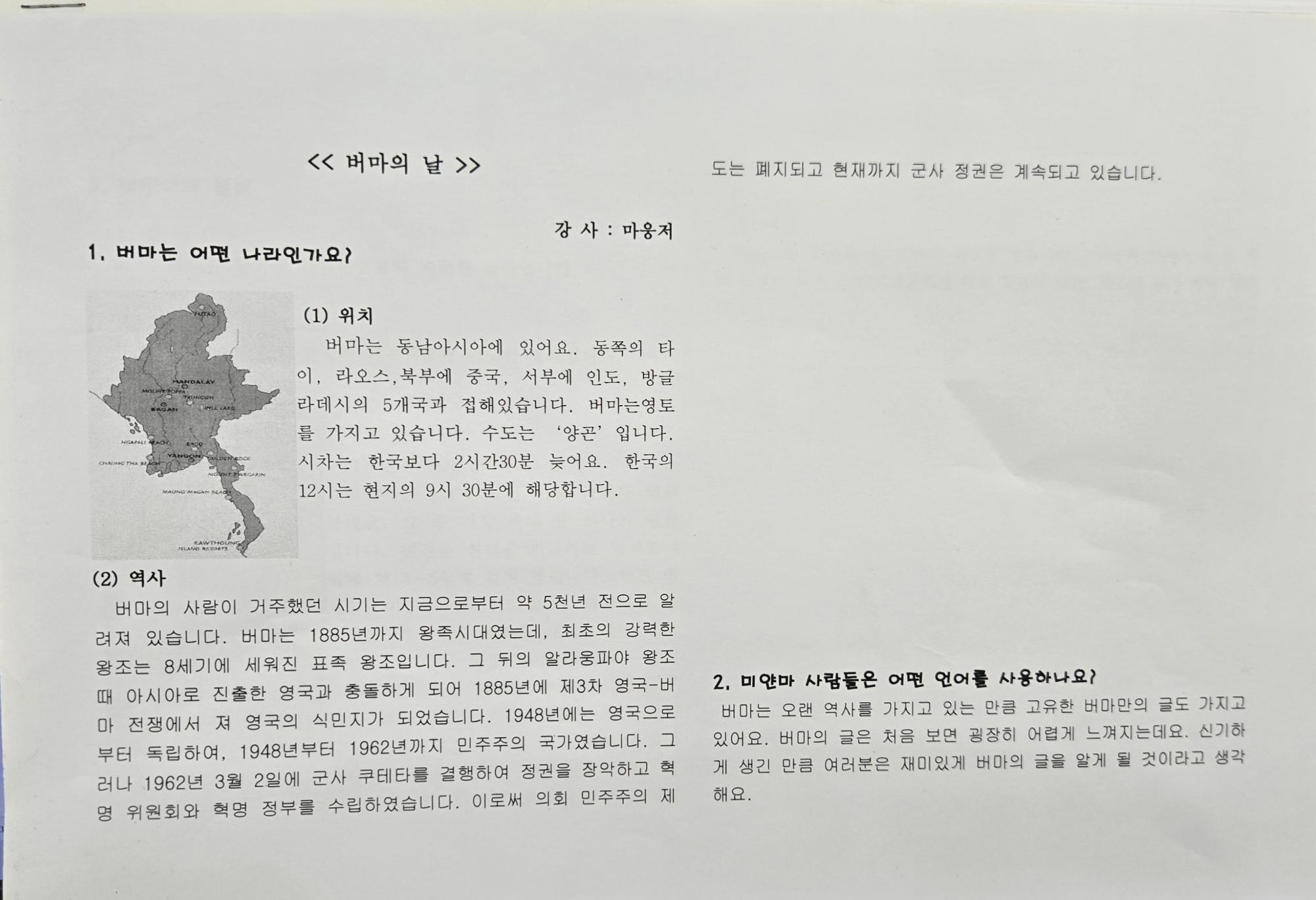 아시아의 친구들에서 이루어진 다문화 가정을 위한 다문화 이해 교육의 일환인 '내친구 아시아' 사업 시리즈 중 버마에 대한 이해교육 자료와 행사 진행을 위한 설명 및 협조 사항, 진행 순서, 프로그램 내용등에 대한 설명서가 담겨있다