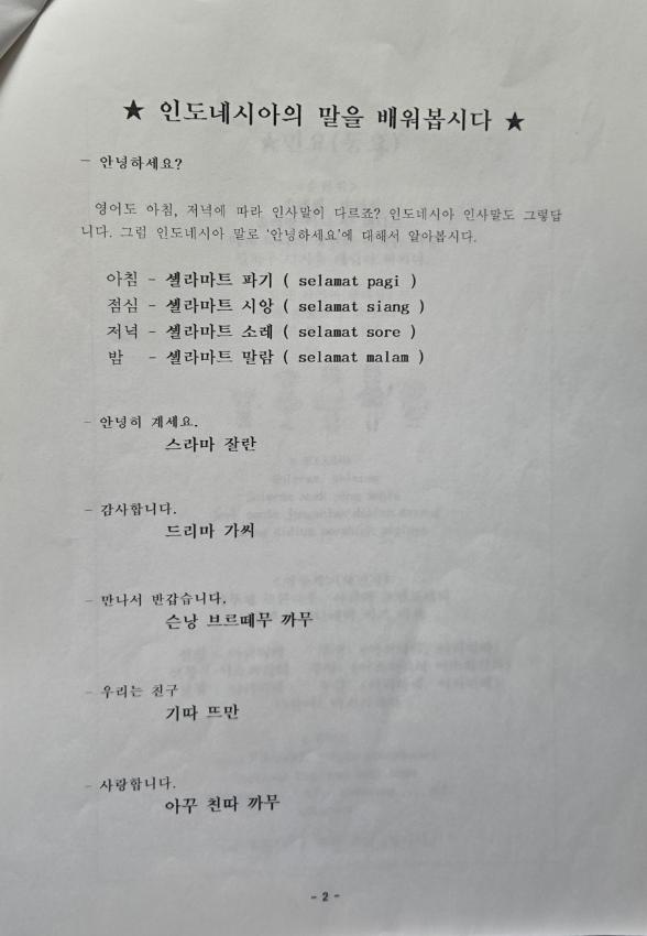 한살림과 아시아의 친구들이 함께한 아시아를 알고 싶어요(인도에시아 / 필리핀 / 버마 ) 사업 중 얀노 선생님이 만든 인도네시아에 대한 교재이다. 인도네시아에 대한 소개, 인사말, 역사, 민요 (동요), 놀이등과 나시고랭 요리법 등을 싣고 있다