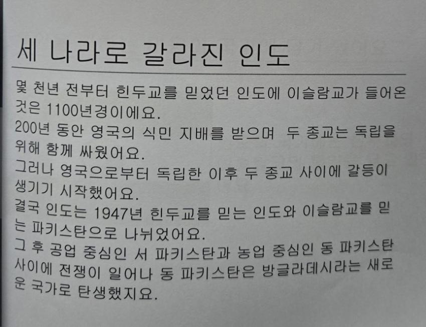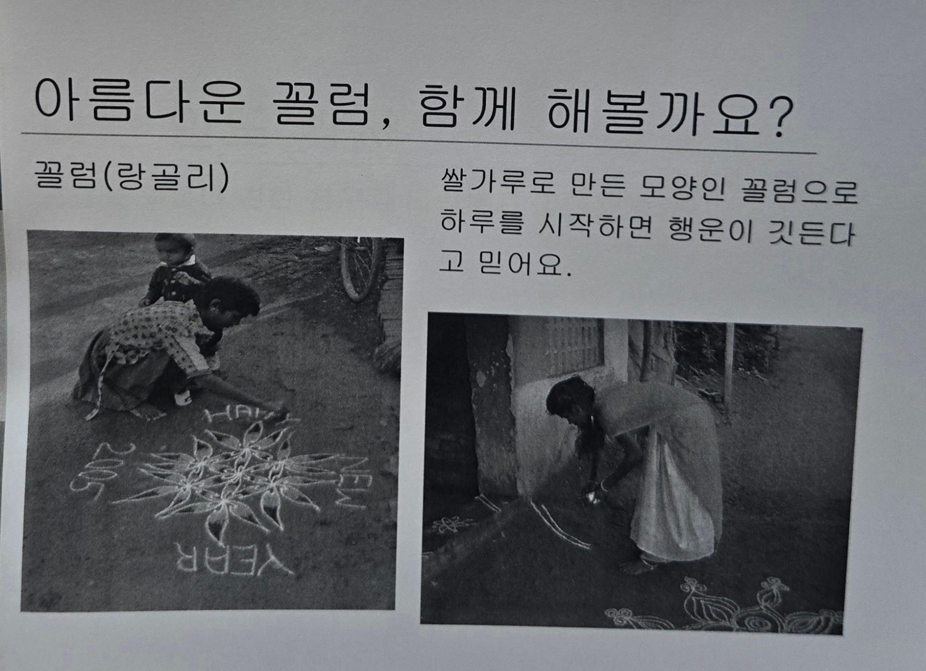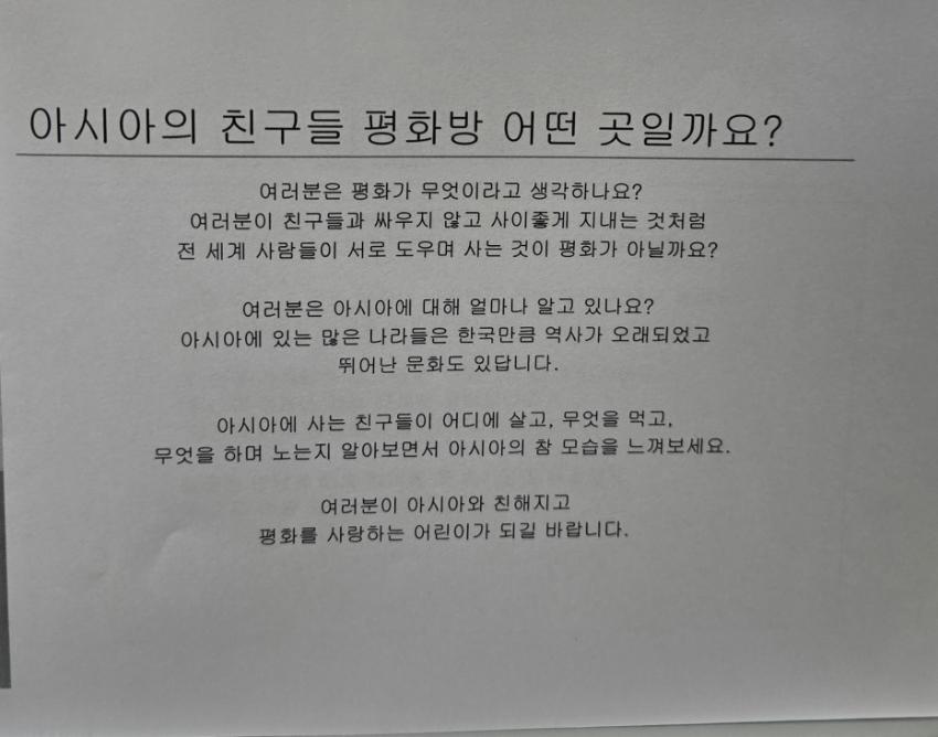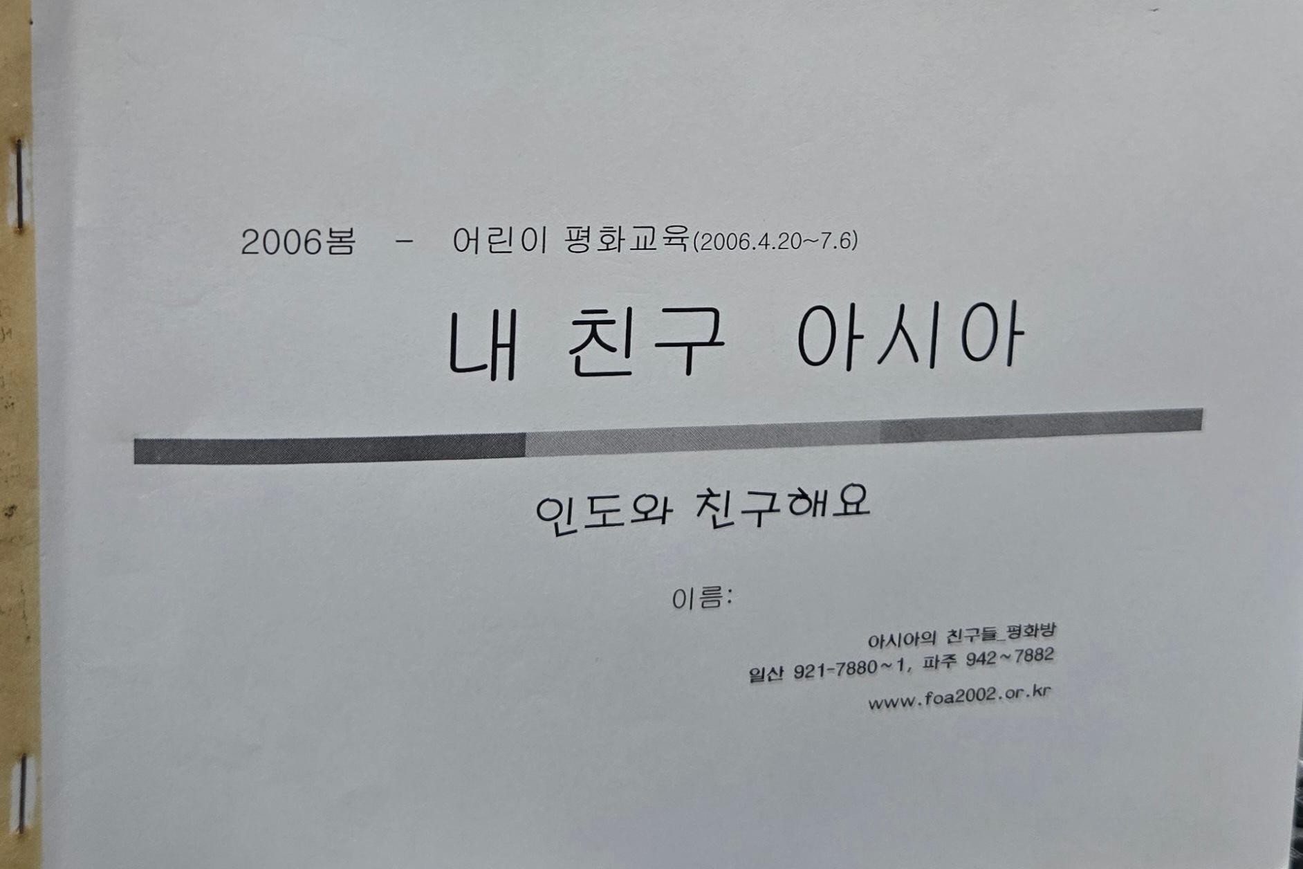 아친에서 평화교육 확산을 위해 사무실 공간을 개조해 만든 공간인 평화방의 2006년 봄 어린이 평화교육 교재중 <인도와 친구해요> 이다 인도 인사말, 인도에 대한 소개, 종교, 축제, 전통 옷, 음식등 다양한 인도의 문화에 대해 소개하고 있다