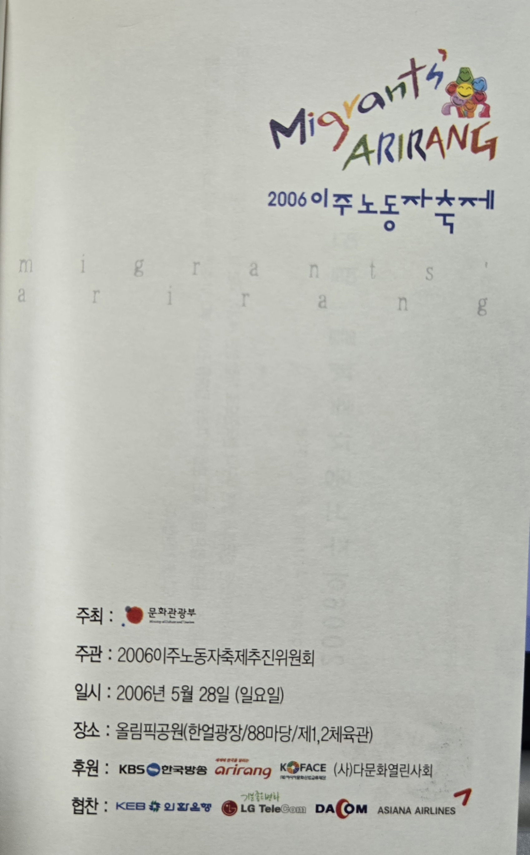 2006년 문화관광부에서 주최하고 2006이주노동자축제추진위원회에서 주관해 2006년 5월 28일에 올림픽공원에서 열린 이주노동자축제에서 발행된 행사용 여권이다