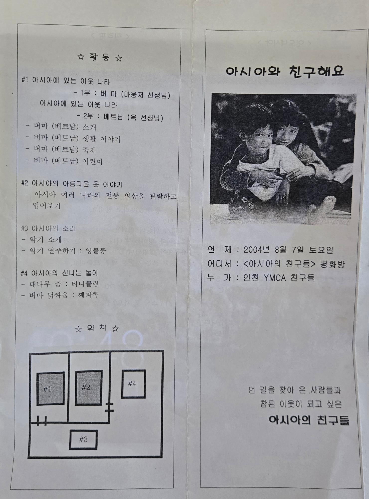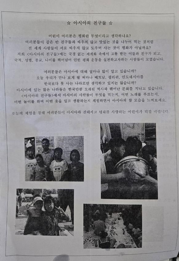 아시아의 친구들에서 평화교육 확산을 위해 사무실 공간을 개조해 만든 공간인 평화방에서 인천 YMCA와 함께 아시아와 친해지고 평화를 사랑하는 어린이로 자라길 바라는 마음으로 마련한 프로그램이다 아시아에 있는 이웃 나라 중 버마, 베트남, 인도네시아, 필리핀에 대한 소개를 하고 있다