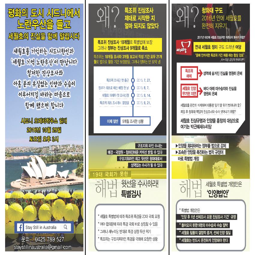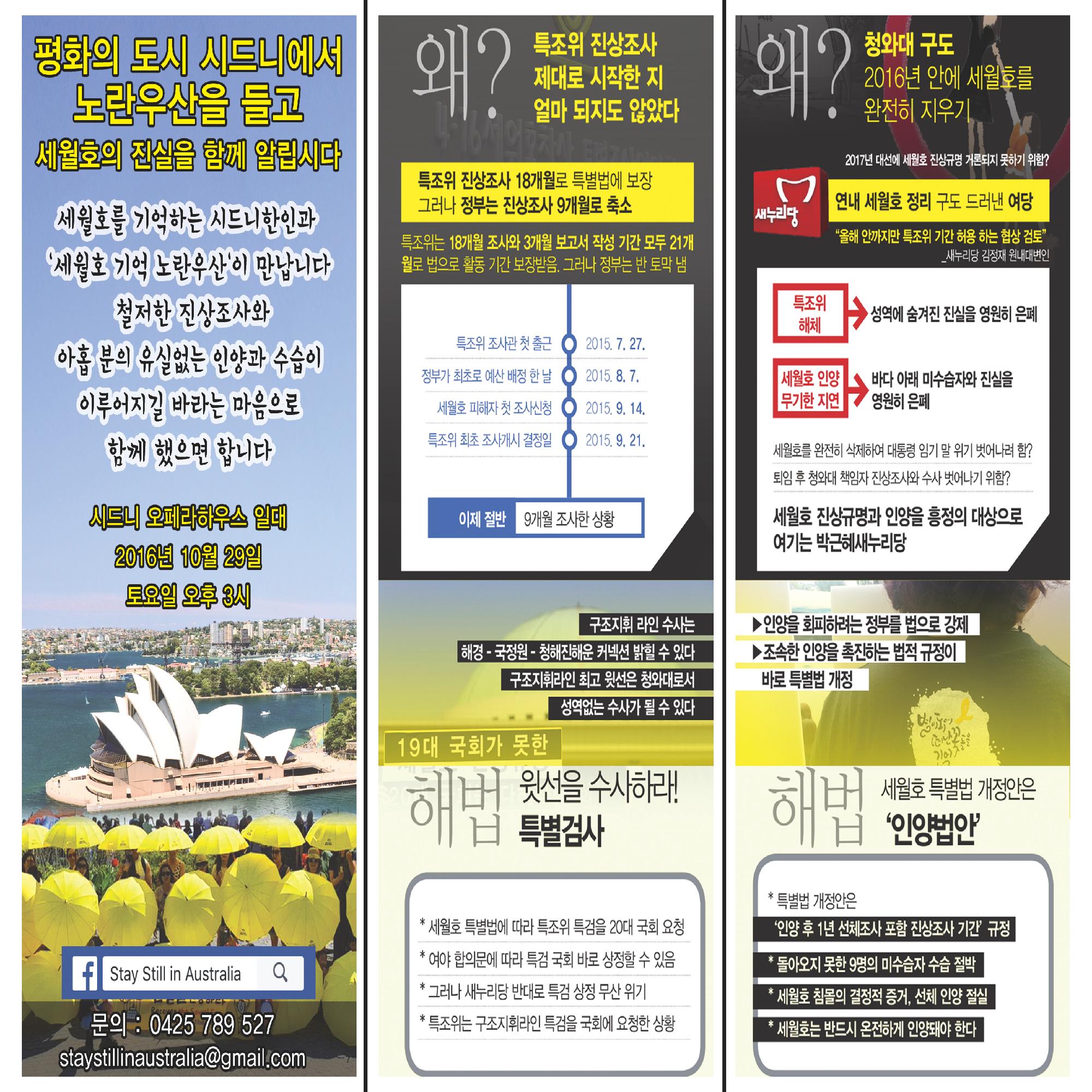 2016년 10월 29일 시드니 오페라 하우스 일대에서 있었던 세월호를 기억하는 시드니한인과 '세월호 기억 노란 우산'이 만나 철저한 진상조사와 아홉 분의 유실없는 인양과 수습을 위해 벌인 노란우산 퍼포먼스 전단이다