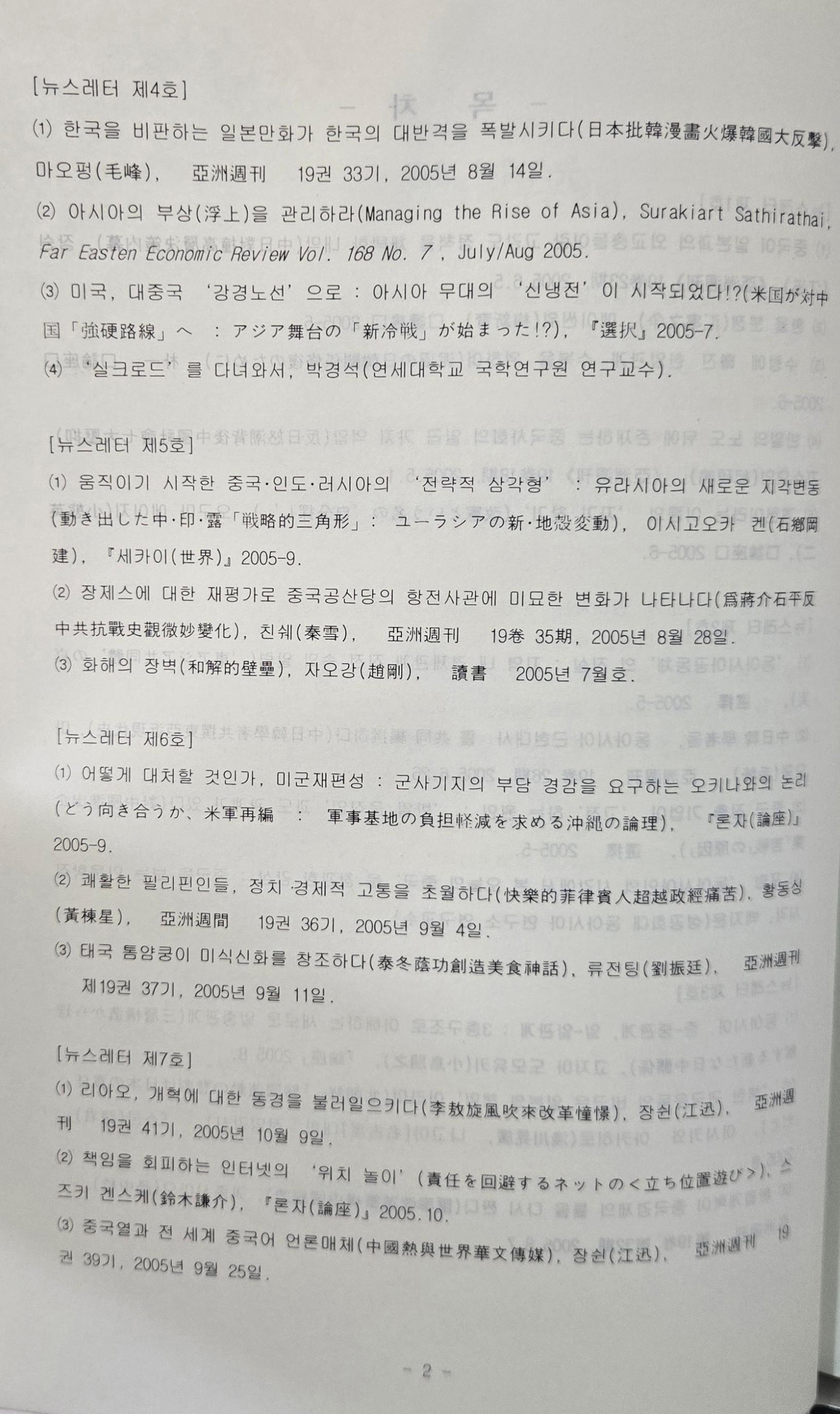 동아시아를 하나의 학문적 사유단위로 삼는 서남포럼에서 저널사업의 일환으로 발행한 뉴스레터 모음집 이다. 뉴스레터는 중국, 일본, 대만, 홍콩, 동남아 등에서 발행된 주요 잡지를 검색하여 주목할 만한 글을 번역해 싣고, 동아시아 관련 학계동향 및 학회 소식, 학회 자료집, 관련 언론기사, 서남포럼 공지사항 등을 싣고 있다