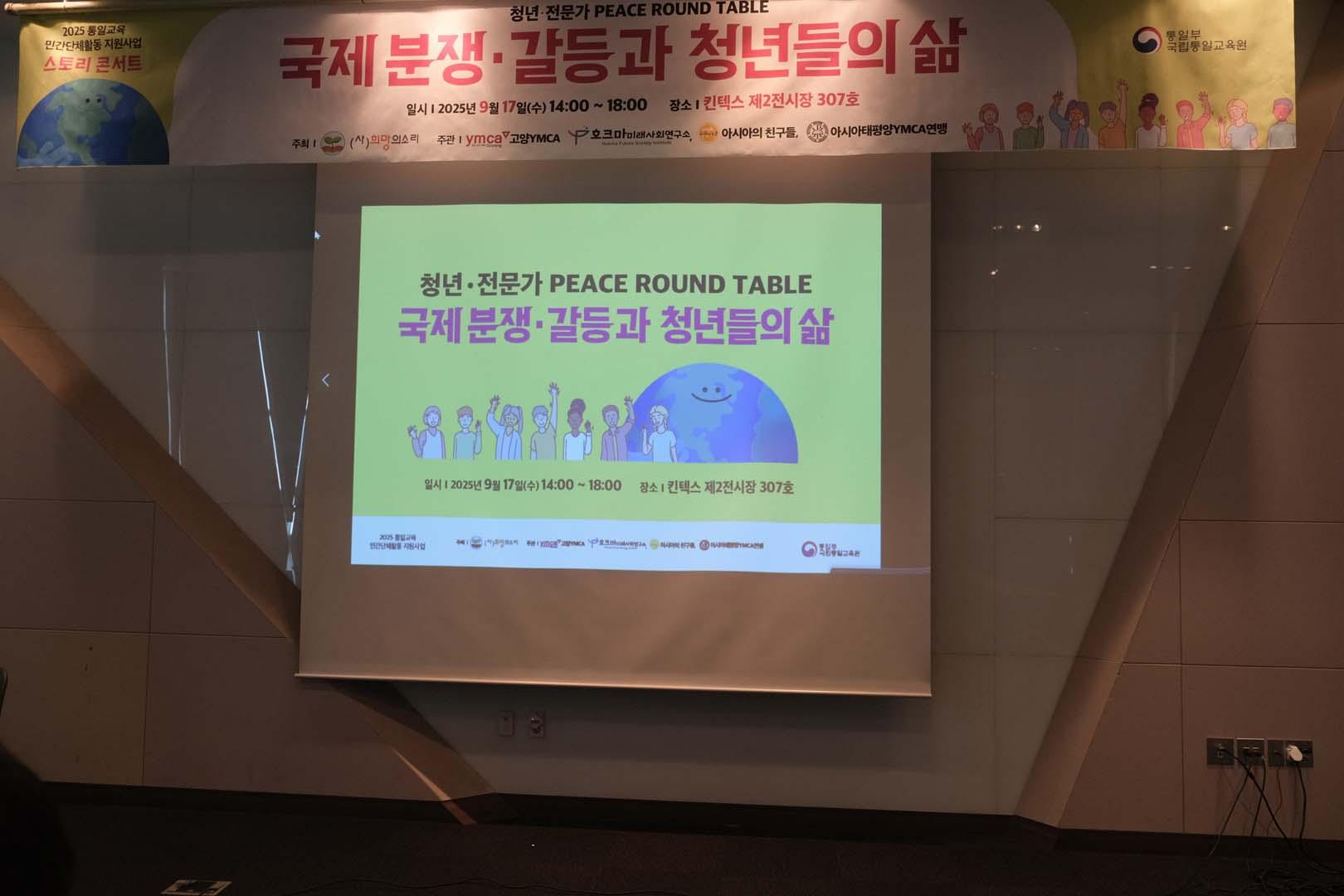 2025년 9월 17일 일산 킨텍스 제2전시장에서 있었던 분쟁과 갈등이 청년들의 삶에 미치는 영향을 알아보고 이를 극복하기 위한 국제사회 청년들의 협력 방안을 모색하는 <청년 · 전문가 평화 ROUND TABLE>행사에 관한 사진이다