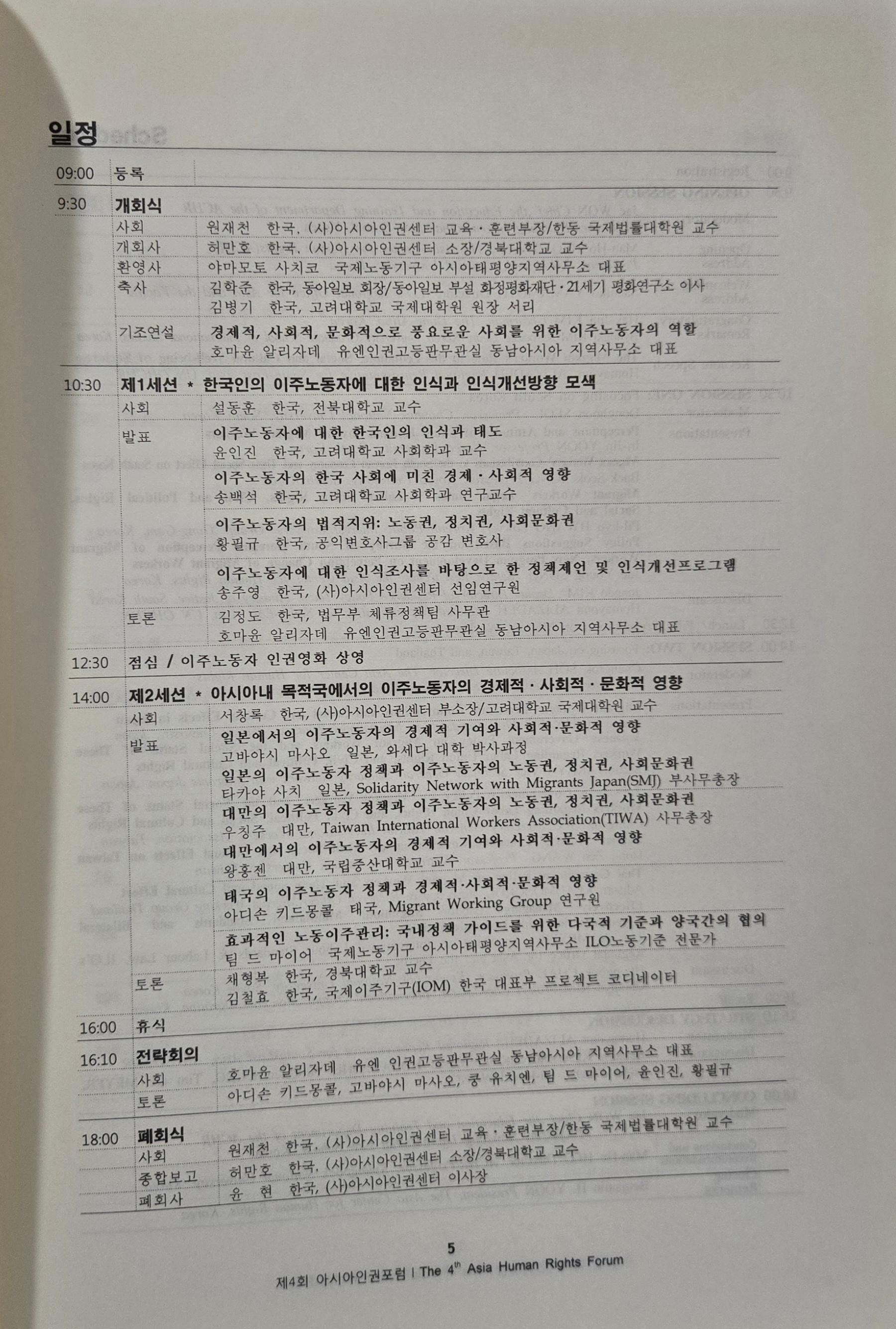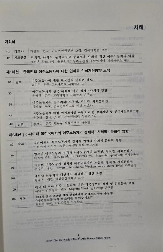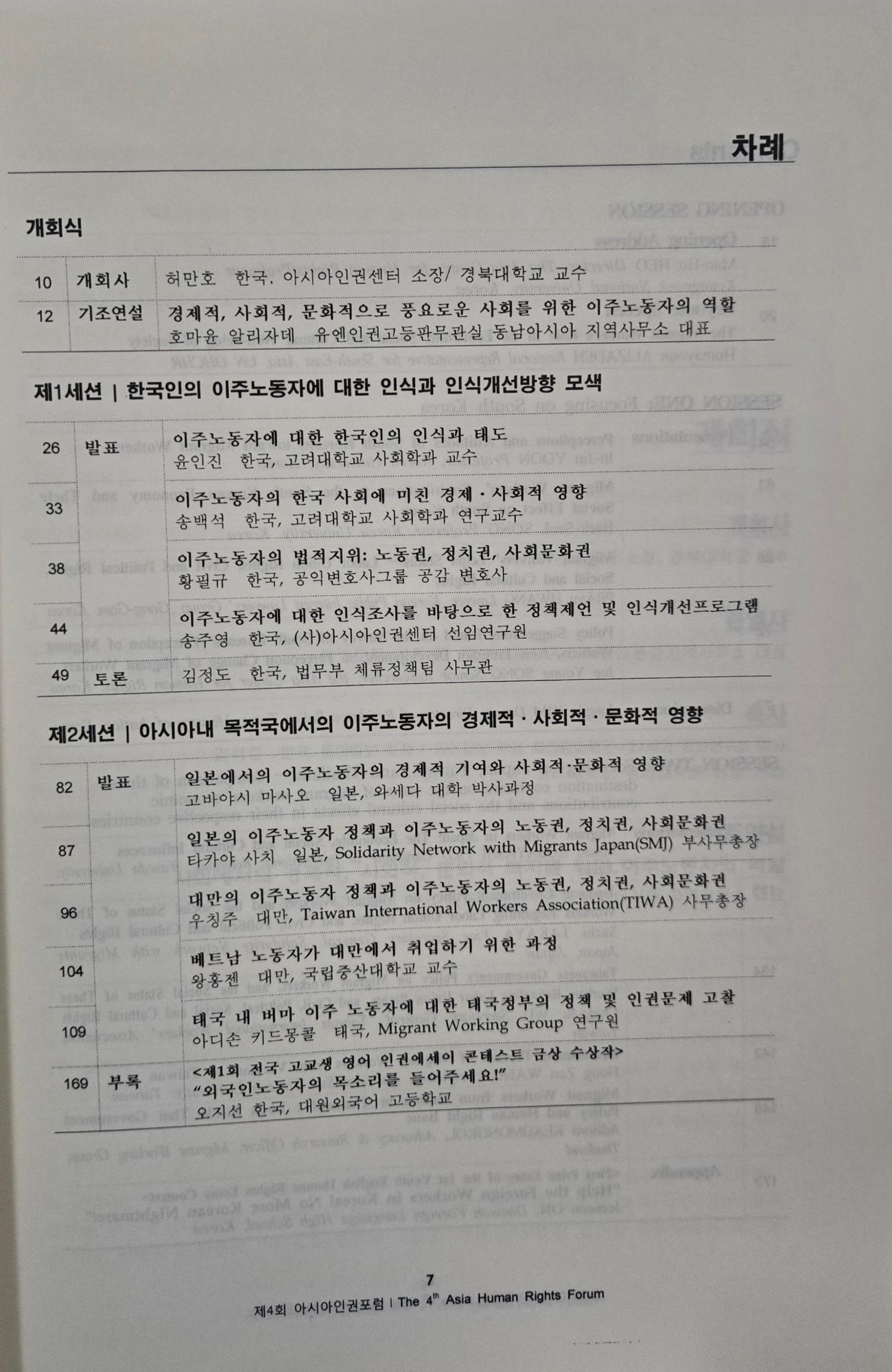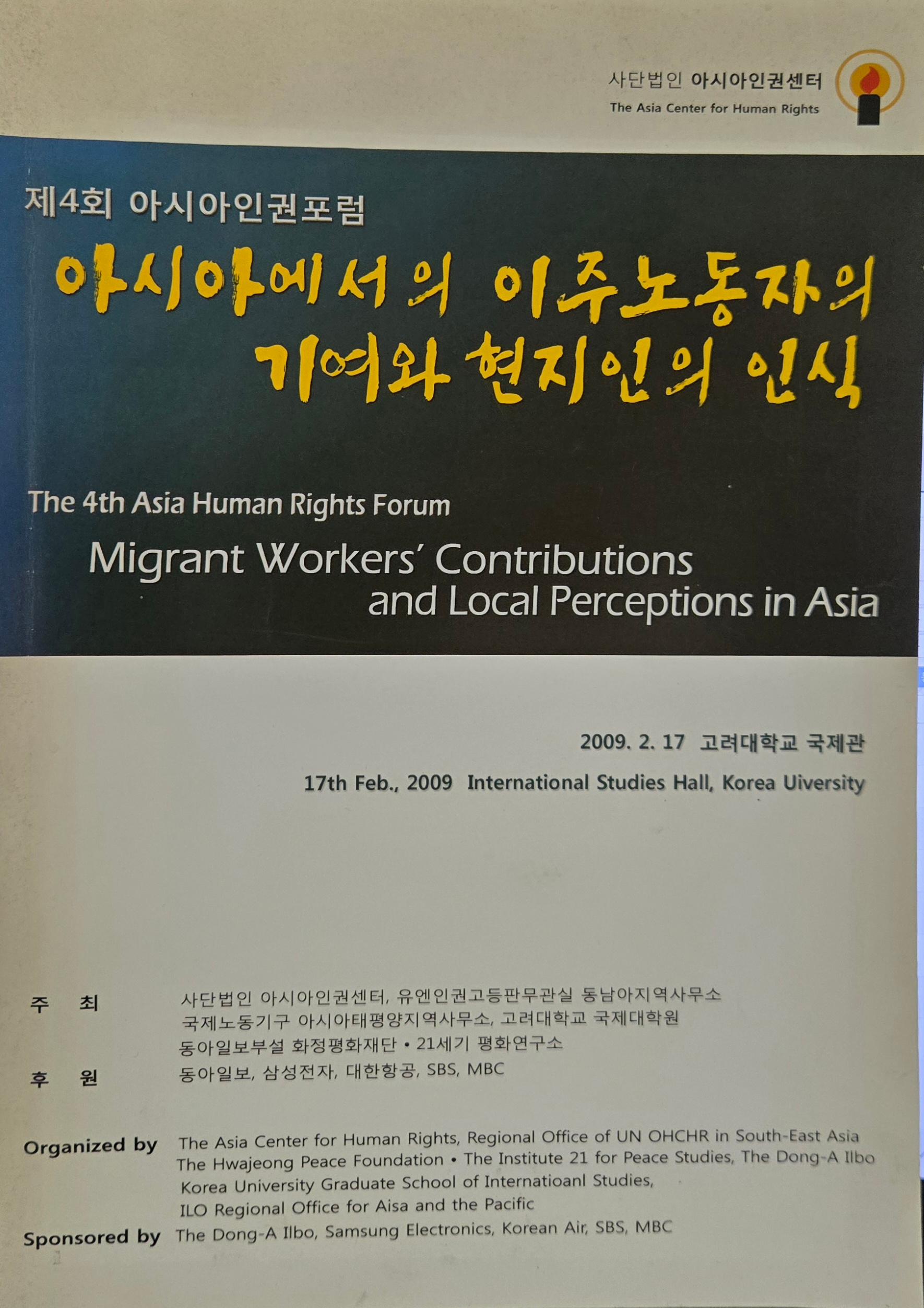 2009년 2월 17일 사단법인 아시아인권센터등이 주최한 <아시아에서의 이주노동자의 기여와 현지인의 인식 > 이라는 주제로 있었던 제4회 아시아인권포럼 자료집이다