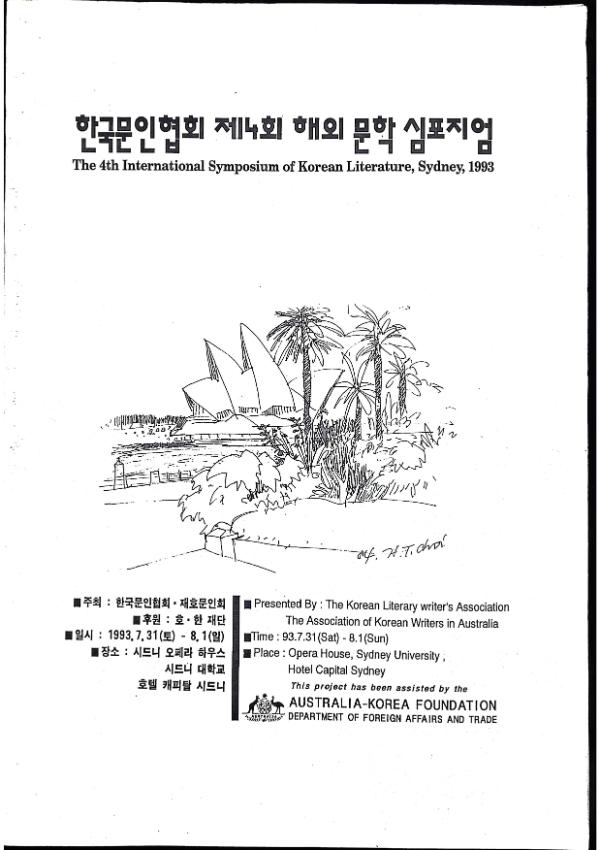 한국문인협회 제4회 해외문학 심포지엄 일시 : 1993.7.31(토) ~ 8.1(일) 주최 : 한국문인협회.재호문인회 후원 : 호.한 재단 장소 : 시드니 오페라 하우스 / 시드니대학교/ 호텔 캐피탈 시드니