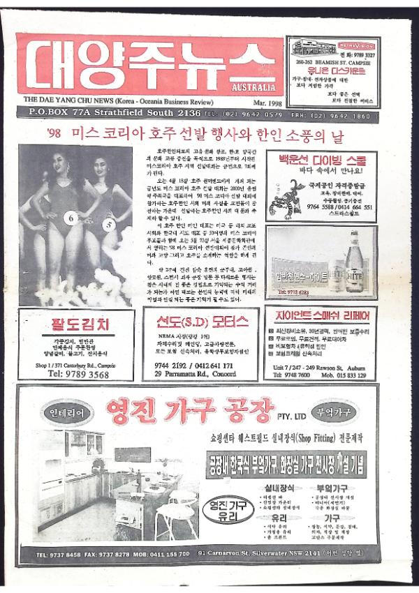 '98 미스코리아 호주 선발 행사와 한인 소풍의 날 / 호주 내쇼날은행(NAB) 이민자사업자 시상식 성료 / '한국신문'"홍두깨" 중대한 오보로 판명 / 강영식장로 교인에게 상조회 탈퇴강요 / 인터뷰 - 엘리엘스 선교무용단을 창설한 송민선씨 / 사랑을 실천하는 목자 - 김진홍목사와 연변과 나진 선봉지구 두레마을 설립이야기 / 조작극에 편승하는 한국신문과 충효운동 / 정치인도 죄가 있으면 처벌받아야 한다