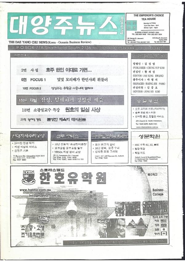 사설 - 호주 한인 이대로 가면... / 고무줄 감사로 혼란 부추겨, 책임질줄 모르는 박학주 이한용 올림픽 후원회 감사 / 몇몇 모리배가 한인사회 휘둘러 / 전자상거래 부정부패 위험 높아 / 이상구박사의 뉴스타트 건강세미나 스케치 - 결국 조물주의 섭리대로 사는 것 / 재벌 삼성, 탈세하며 경영권 세습 / 소광섭교수 특강 - 원효의 일심사상 / 불쌍한 체육회 대의원들