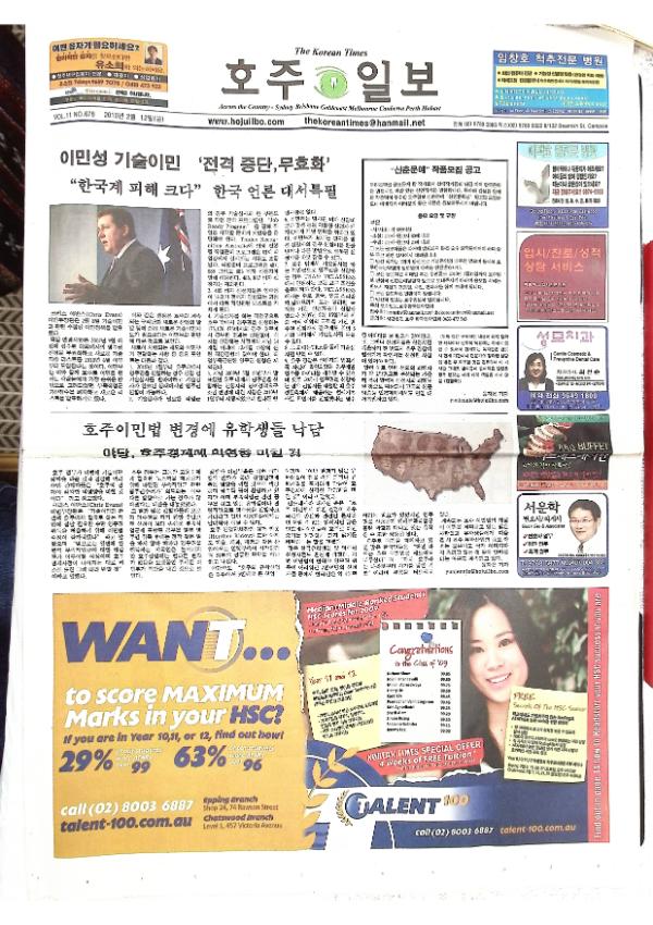 이민성 기술이민 '전격중단, 무효화' - "한국계 피해 크다" 한국 언론 대서특필 / 호주이민법 변경에 유학생들 낙담 / 국회의원이 연쇄살인범과 같아? - 여당의원 발언에 비난일색 "너무했다" / 시드니 한인회 아이티 구호성금 행사 성황 / NSW 경찰청장 교통사고 은폐의혹 - 청장측 '근무시간외 일' 보고할 필요없어 / 호일전열제 설치한 가정, 전기감전 위험 / 20년만에 내린 폭우에 거머리수 증가 /학교 성적순 발표로 교원노조와 정부와 충돌