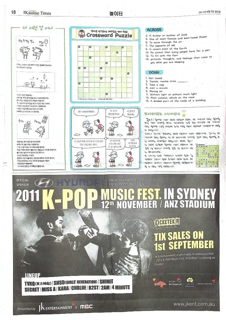 호주에서 2011년 8월 5일 발행된 The Kaussie Times 제3호로 록뮤직 페스티벌 'ROCKOR2011' / 제주 - 세계 7대 자연경관 선정기원 국제 영어 Speech 대회 / 한국 애니메이션 역사 다시 쓰나 '마당을 나온 암탉' / Measure of Siciety / 분자 생물학, 중심원리가 깨지고 있다 등의 기사를 싣고 있다