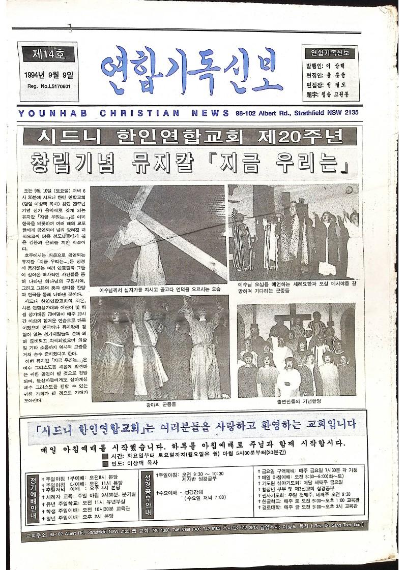 호주에서 1994년 9월 9일 발간된 연합기독신보 Younhab Christian News 제 14 호이다 시드니 한인연합교회 제 20주년 창립기념 뮤지컬 <지금 우리는> / 교민2세의 가치관 교육 / 하나님의 영광을 드러내는 신앙 / 연합교회의 전신인 스트라스필드 회중교회의 역사 / 선교통신 - 헝가리 등의 기사를 싣고 있다
