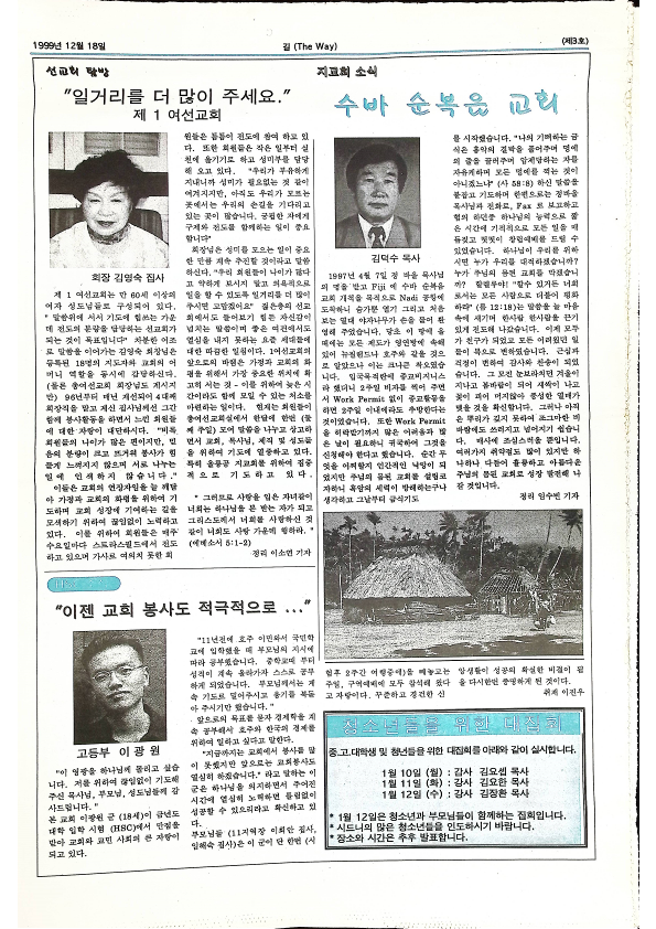 1999년 12월 18일에 호주에서 발간된 시드니 순복음교회의 제 3 호 소식지이다 큰 기쁨의 좋은 소식 / 절망을 만났을 때 / 어느 탈북동포의 편지 / 약속있는 첫 계명 / 수바 순복음 교회 / 나를 고쳐주신 하나님 / 방주 일기 등을 싣고 있다
