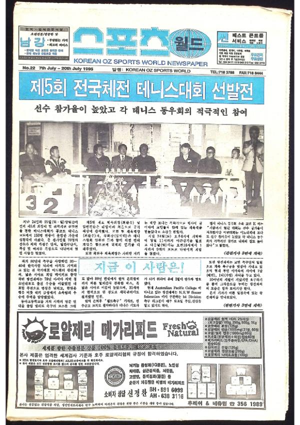 1995년 7월 7일 ~7월 20일에 KOREAN OZ SPORTS WORLD에서 발행한 스포츠월드 No.22호 이다 제5회 전국체전 테니스대회 선발전 / 체육회 소식 / 해외 스포츠 : 아가시, 샘프라스 나란히 4강 안착 / 교민 게시판 / 독자의 글 : 수필 가을 이야기 / 스포츠 : 가자! 꿈의 4강으로 등을 싣고 있다
