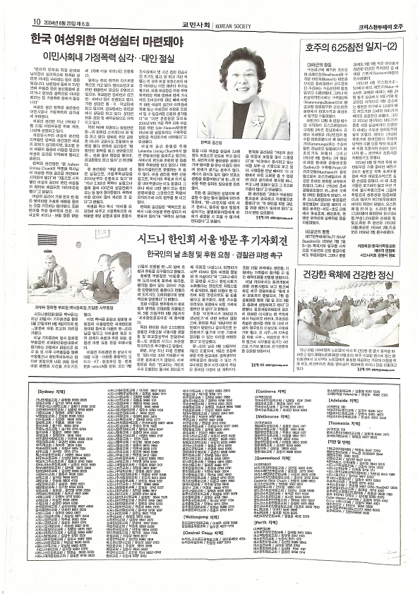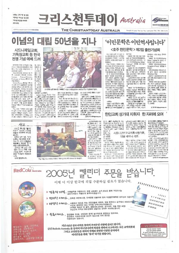 2004년 6월 25일 호주에서 발행된 크리스천투데이 호주 제 6호이다 이념의 대립 50년을 지나 / 김선일씨 피살돼 / 강원용목사, 옥한흠목사 대담 / 다시 보는 종교개혁자의 영성 / 한국여성 위한 여성쉼터 마련돼야 등을 싣고 있다