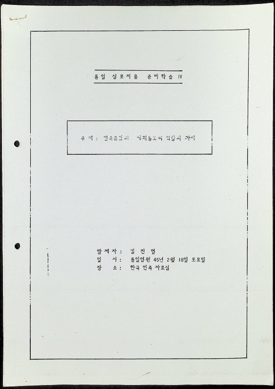 1989년 2월 18일에 김진엽에 의해 작성된 통일 심포지움 준비학습 자료이다 들어가는 말 / 현대시대 세계의 모순에서 비추어본 우리의 문제 / 민족 통일 운동의 주체 / 해외동포에 대한 본국의 인식 / 해외동포의 통일 운동사 / 해외운동의 역할과 과제 / 맺음말 / 참고자료 목록으로 구성되어 있다
