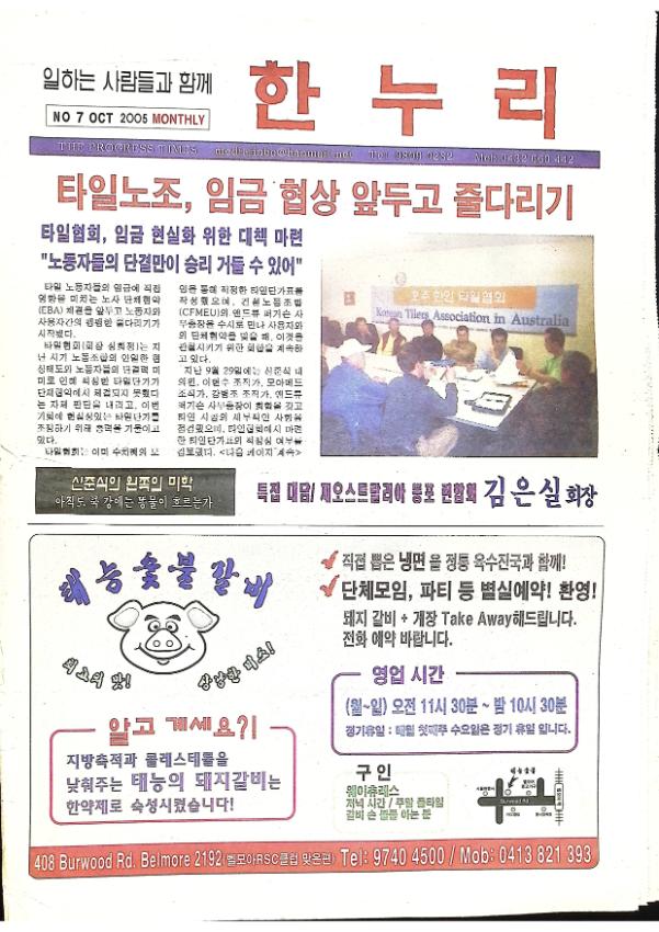 호주에서 노동자들을 위해 발행된 신문인 한누리 2005년 10월호로 No.7호이다 타일노조, 임금 협상 앞두고 줄다리기 / 한인회 무엇이 문제인가 / 우리의 조국은 하나이어야 합니다 / 칼럼 '신준식의 왼쪽의 미학' / 어느 꼴통 언니와의 은밀한 계획 / 역사를 견인하는 사람들 : 백범 김구 등을 싣고 있다