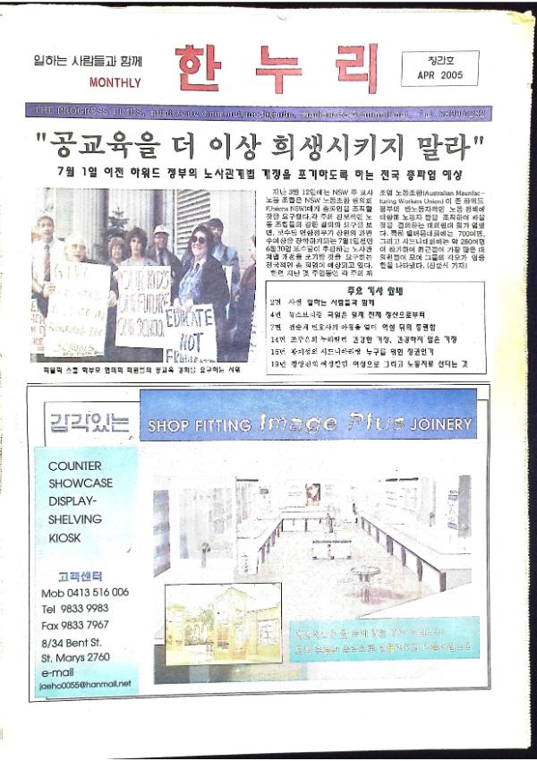 호주에서 2005년 4월에 노동자들과 함께하는 월간지로 발행된 한누리 창간호이다 공교육을 더 이상 희생시키지 말라 / 사설 : 일하는 사람들과 함께 / 칼럼 '역설이 주는 통렬함' / 토론 : 신준식, 백석근, 신현돈 / 역사를 견인하는 사람들 체 게바라 등을 싣고 있다