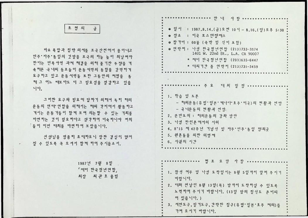 1987년 8월 14일 부터 16일까지 미국 로스엔젤레스에서 재미 한국청년연합에서 마련한 해외동포대회 초청장이다
