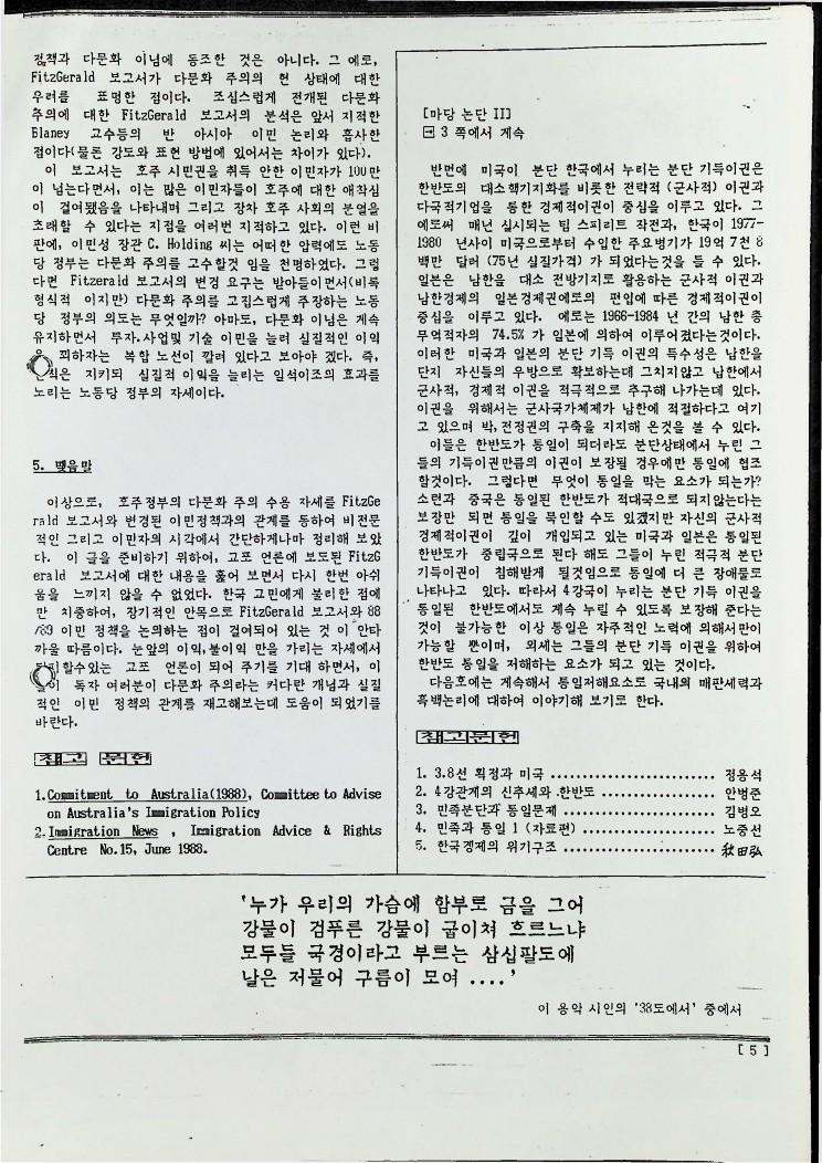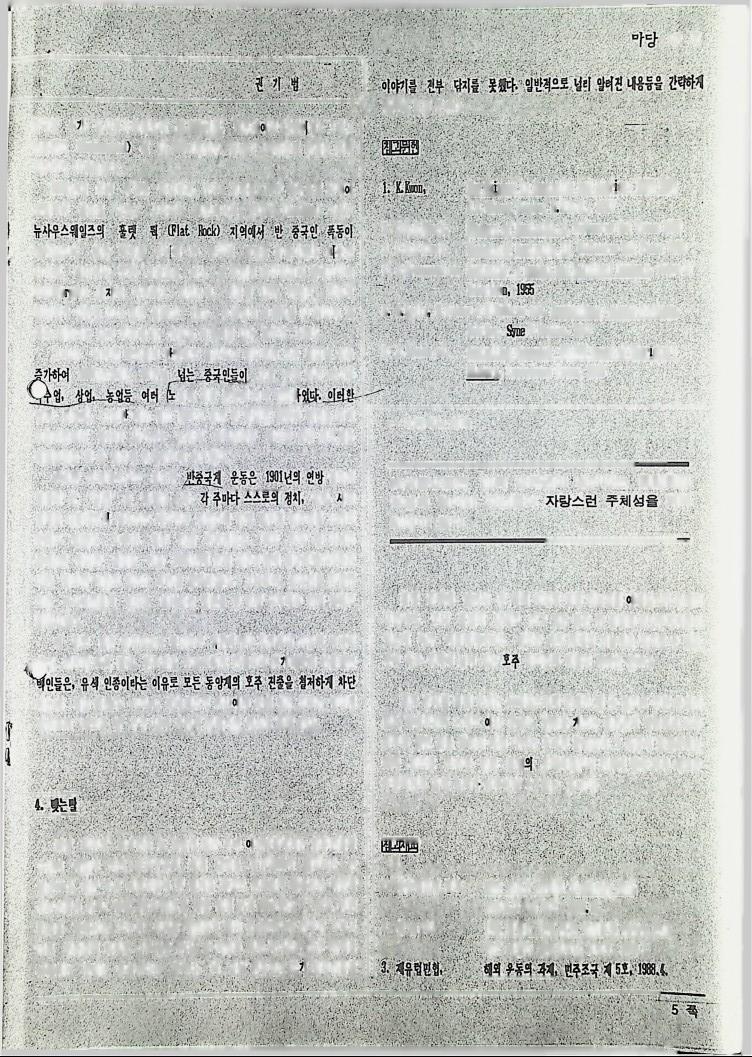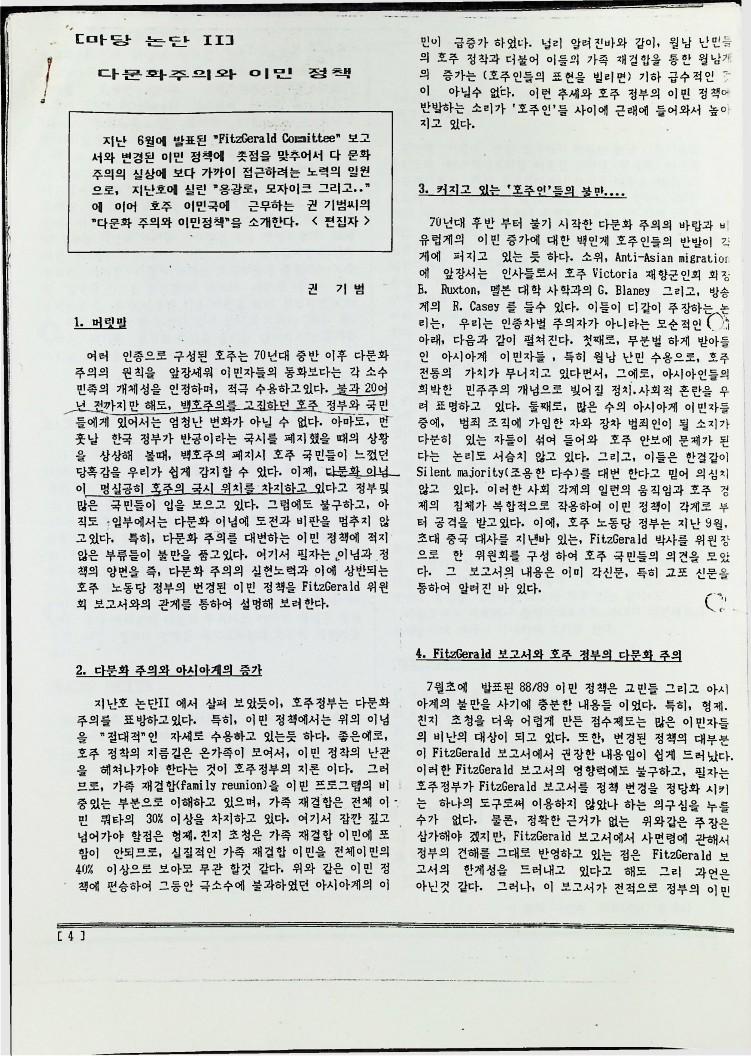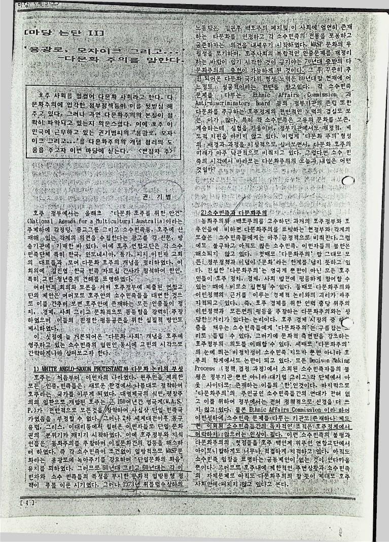 호주에서 발간된 '마당'지에 실린 마당논단으로 다문화 주의의 개념을 정리하는데 도움을 주기 위한 호주 이민국에 근무하는 권기범의 "다문화 주의와 이민정책", "용광로, 모자이크 그리고 .."기사이다 또 이민자의 입장에서 본 호주 역사 시리즈로 실린 "원주민 그리고 중국인의 역사", "19세기 말부터 20세기 초까지의 호주역사" 기사이다