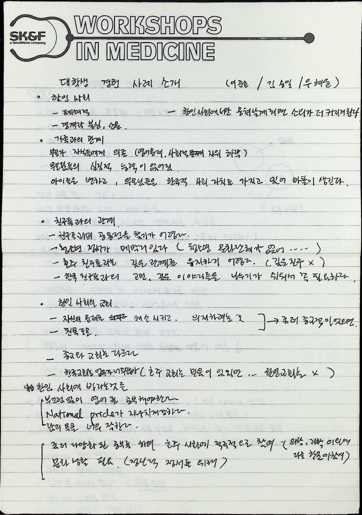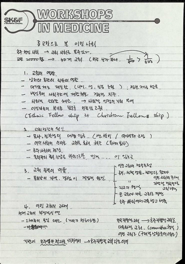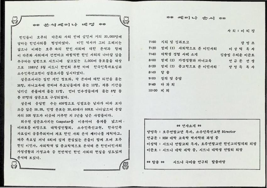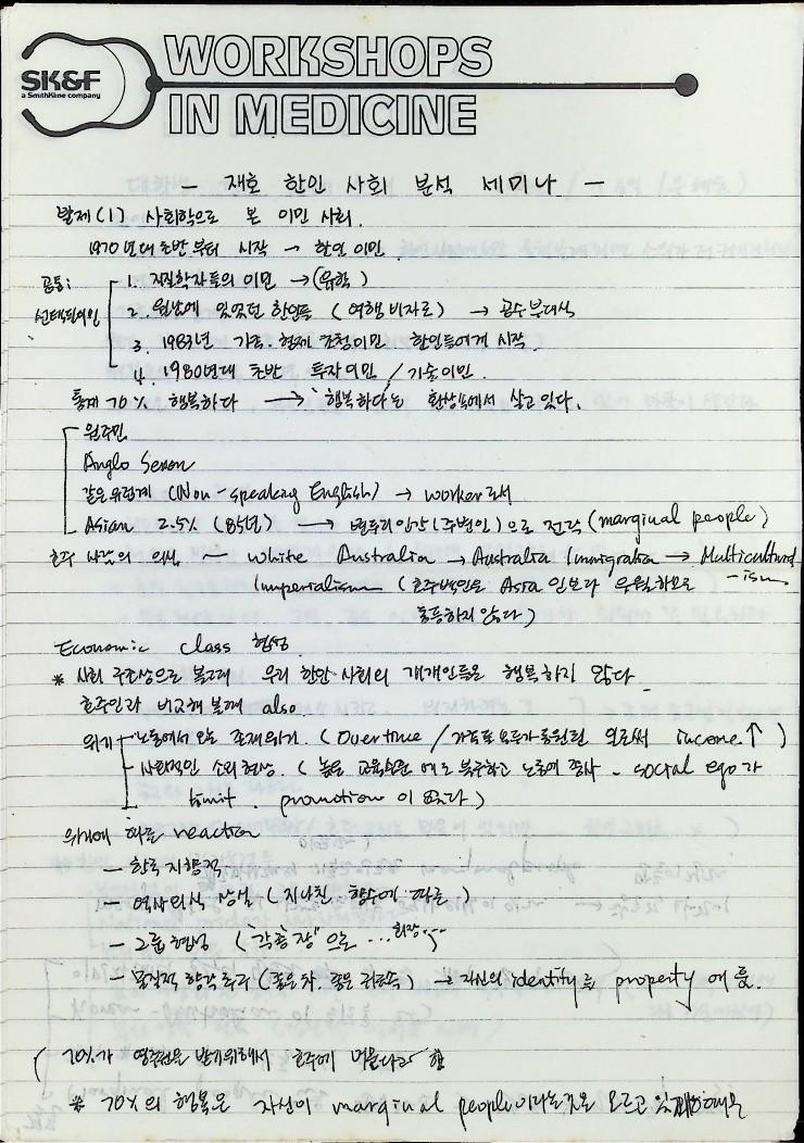 1990년 2월 24일 호주 갈릴리연합교회에서 열린 재호 한인사회 분석 세미나 '이민 생활 행복하십니까?'의 자료와 개인 노트이다 한민족자료실, 소수민족선교원, 대학생연합회 공동 주최이다