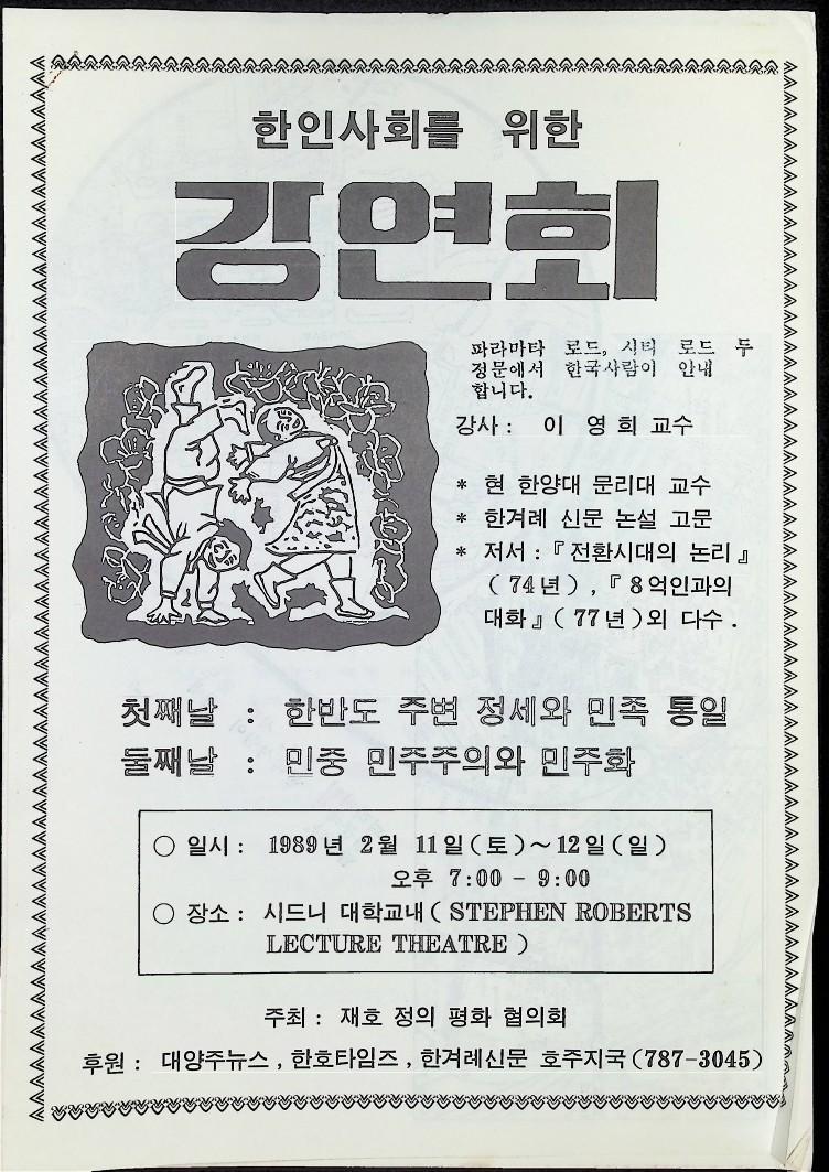 1989년 2월 11일에 호주에서 있었던 한인사회를 위한 강연회의 전단지이다 첫째날- 한반도 주변 정세화 민족 통일 , 둘째날 - 민중 민주주의와 민주화 주제로 재호 정의 평화 협의회가 주최하고 한양대 이영희교수가 강연했다
