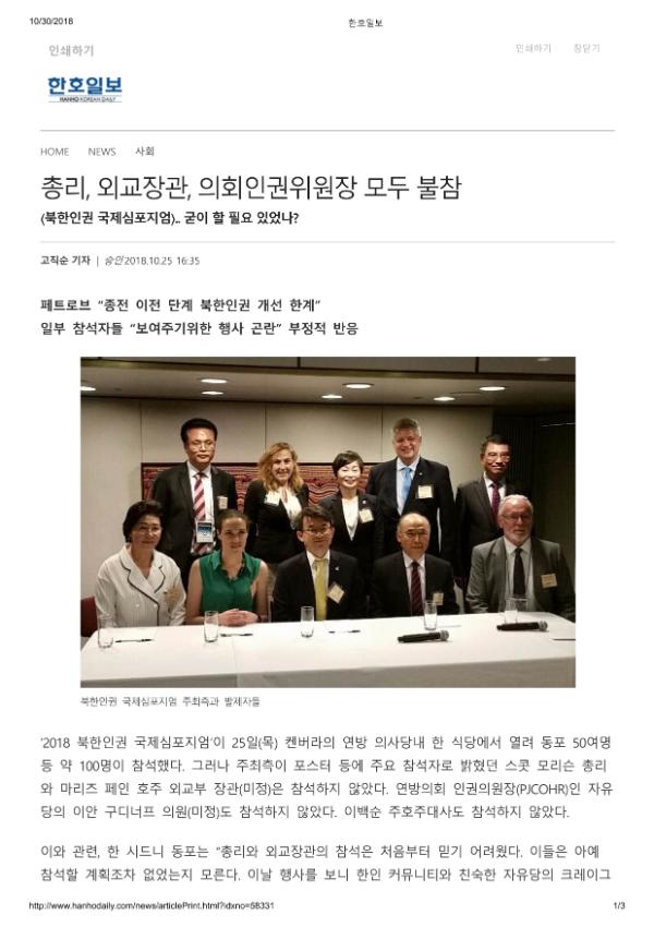 2018년 10. 25일 호주 캔버라에서 열린 북한 인권 국제회의