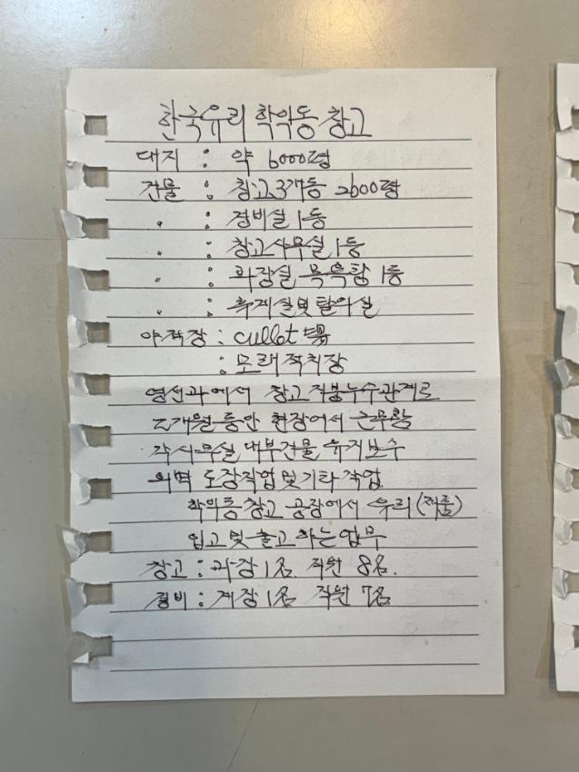 2025년 11월 3일에 진행된 면담의 면담자는 지역 기록자 곽은비이며제물포역 지하도상가 열린공간1에서 진행되었다. 1973년 한국유리 영선과에 공원으로 입사하여 1996년까지 근무하면서, 학익동 유리창고에 파견나가 경험했던 학익동 창고에서의 근무 생활과 23년 동안 한국유리 회사 생활에 대해 사전 인터뷰를 통해 구술했다.