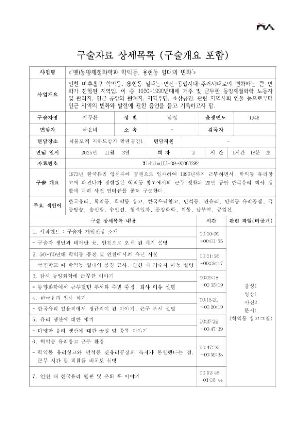 2025년 진행된 ‘옛)동양제철화학과 학익동, 용현동 일대의 변화’ 기록 과정의 일환으로 진행된 면담에서 만들어졌다.