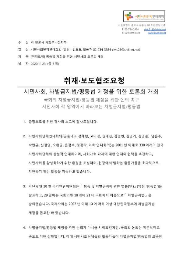 [보도자료] 시민사회, 차별금지법/평등법 제정을 위한 토론회 개최
