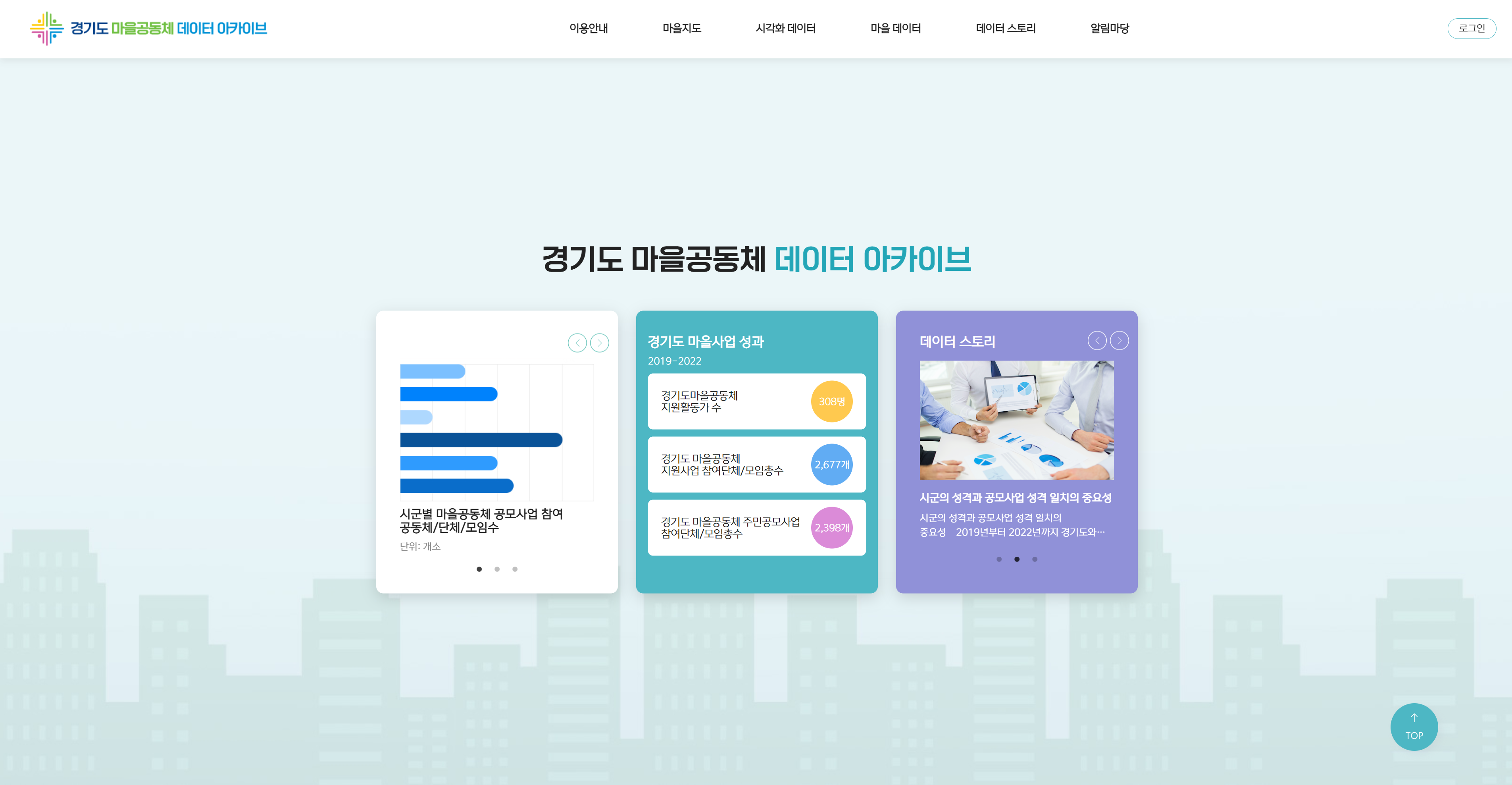 "경기도 마을공동체 자원과 정성적, 정량적 성과를 종합적으로 확인하고 마을 데이터를 공유하는 서비스입니다. 경기도 마을공동체 기초조사를 활용한 마을 정보 및 시각화를 제공하고, 경기도 마을공동체 데이터 관리 솔루션 기능을 서비스하며, 경기도 마을공동체 정책자료 산출 및 인사이트를 도출합니다."