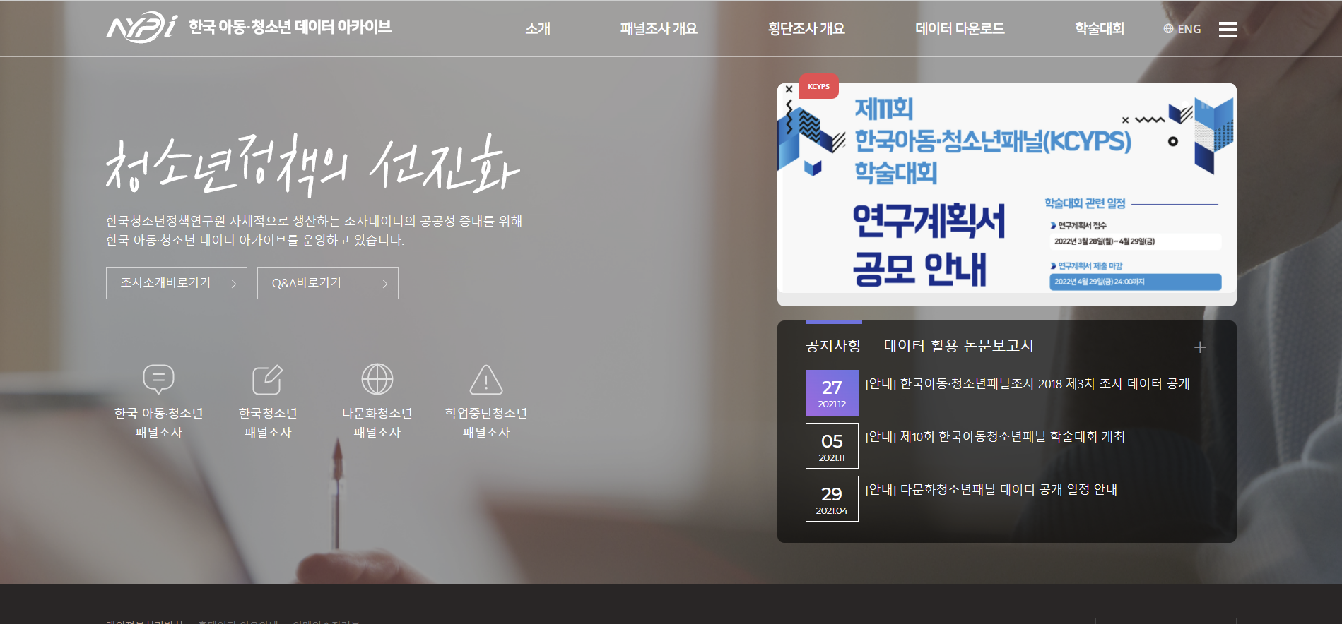 "한국 아동·청소년 데이터 아카이브는 한국청소년정책연구원 자체적으로 생산하는 조사데이터의 공공성 증대를 위해 운영하는 아카이브입니다.