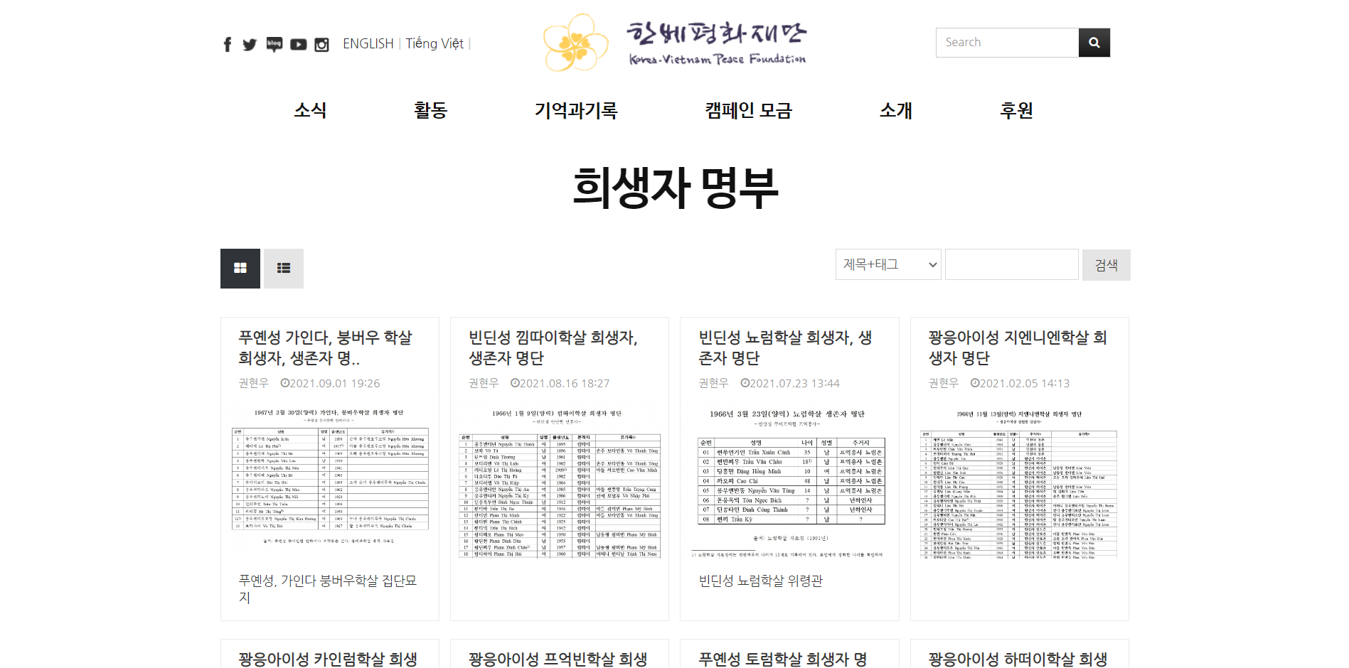 한베평화재단은 홈페이지에 '기억과 기록' 항목을 개설하여 전쟁 피해자들의 증언 구술, 베트남 전쟁 위령비 사진, 각종 문헌기록과 희생자 명부 기록을 서비스하고 있습니다.