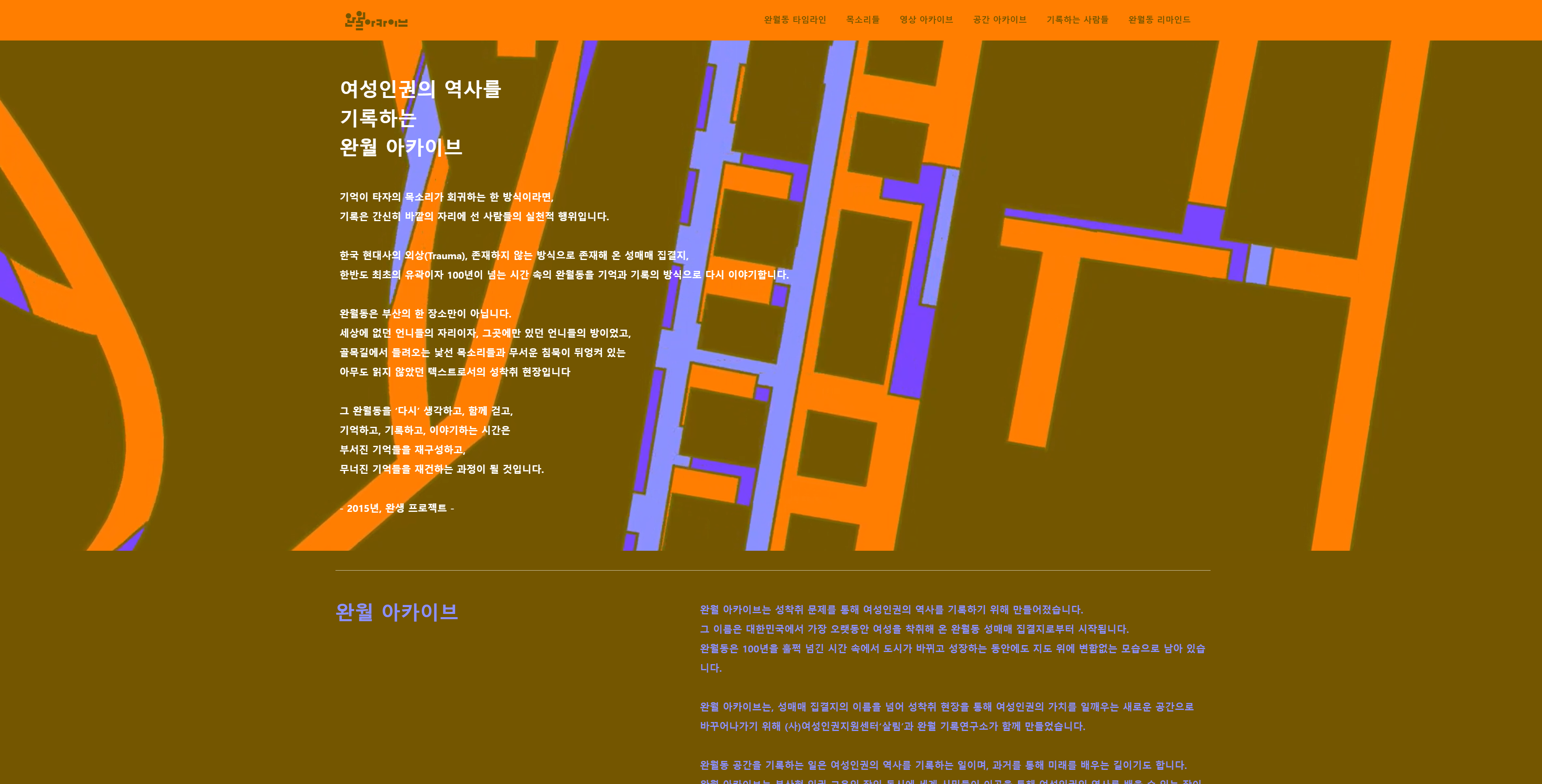 "완월아카이브는 성착취 문제를 통해 여성인권의 역사를 기록하기 위해 만들어졌습니다. 그 이름은 대한민국에서 가장 오랫동안 여성을 착취해 온 완월동 성매매 집결지로부터 시작됩니다.