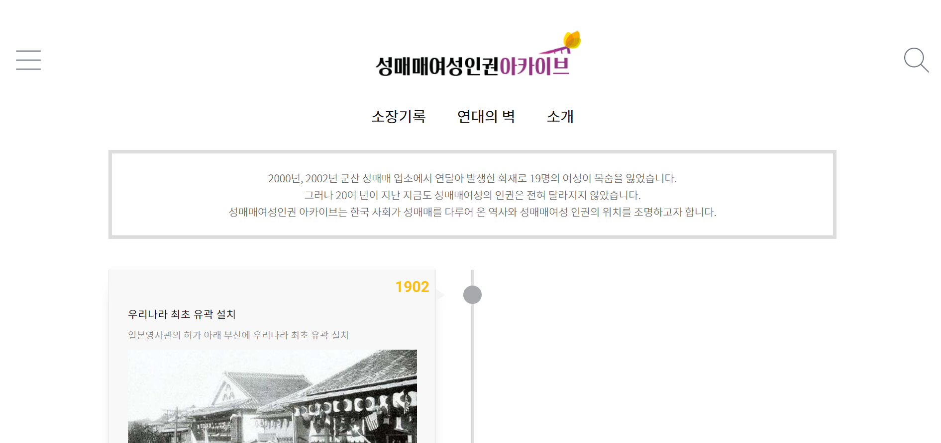 "성매매여성인권아카이브는 한국 사회가 성매매를 다루어 온 역사와 성매매여성 인권의 위치를 조명하고자 합니다. 2000년, 2002년 군산 성매매 업소에서 연달아 발생한 화재로 19명의 여성이 목숨을 잃었습니다. 그러나 20여 년이 지난 지금도 성매매여성의 인권은 전혀 달라지지 않았습니다.