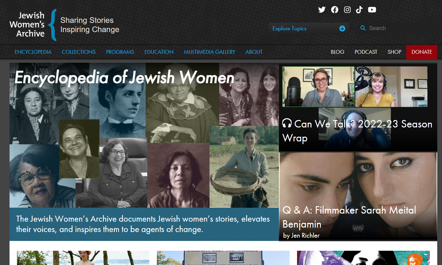 "The Jewish Women's Archive는 유태인 여성의 특별한 이야기를 수집하고 홍보하는 데 전념하는 국제 조직입니다. JWA는 우리 시대의 시급한 문제를 이해하기 위한 틀로써 과거를 탐구합니다. 놀라운 역할 모델로 젊은이들에게 영감을 줍니다. 그리고 유대인 여성의 이야기를 사용하여 사람들이 자신을 변화의 주체로 보도록 자극합니다.