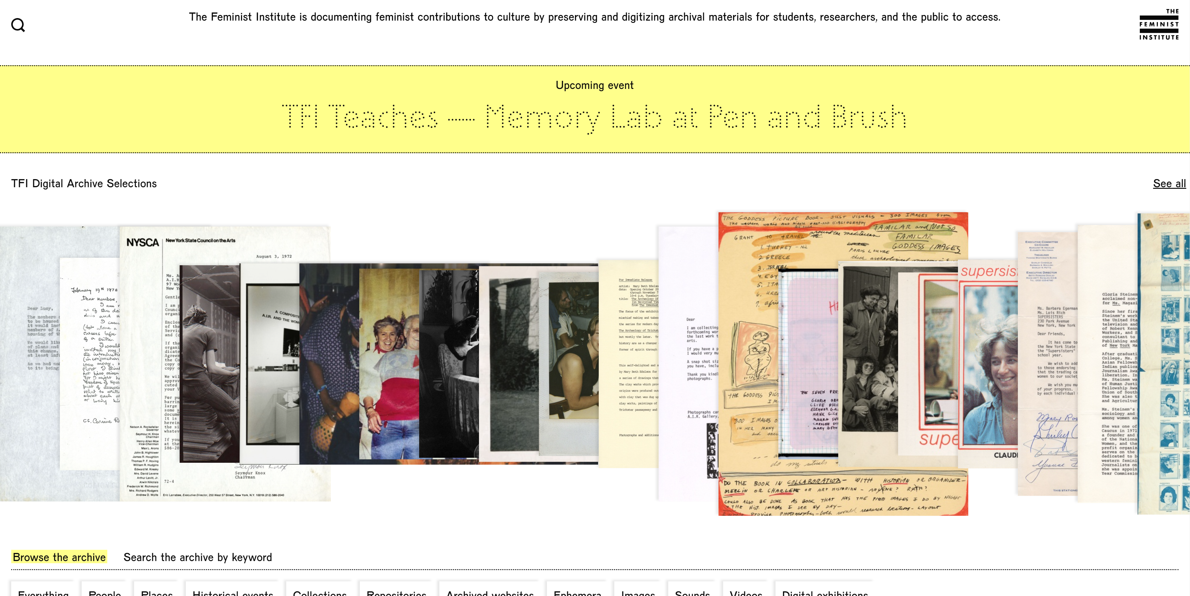 "Feminist Institute(TFI)는 대중이 접근할 수 있도록 아카이브 자료를 보존하고 디지털화하여 문화에 대한 페미니스트의 기여를 기록하고 기념합니다. TFI는 더 완전한 진실을 반영하기 위해 문화 기록을 채워 정보 활동주의와 성평등을 촉진합니다.