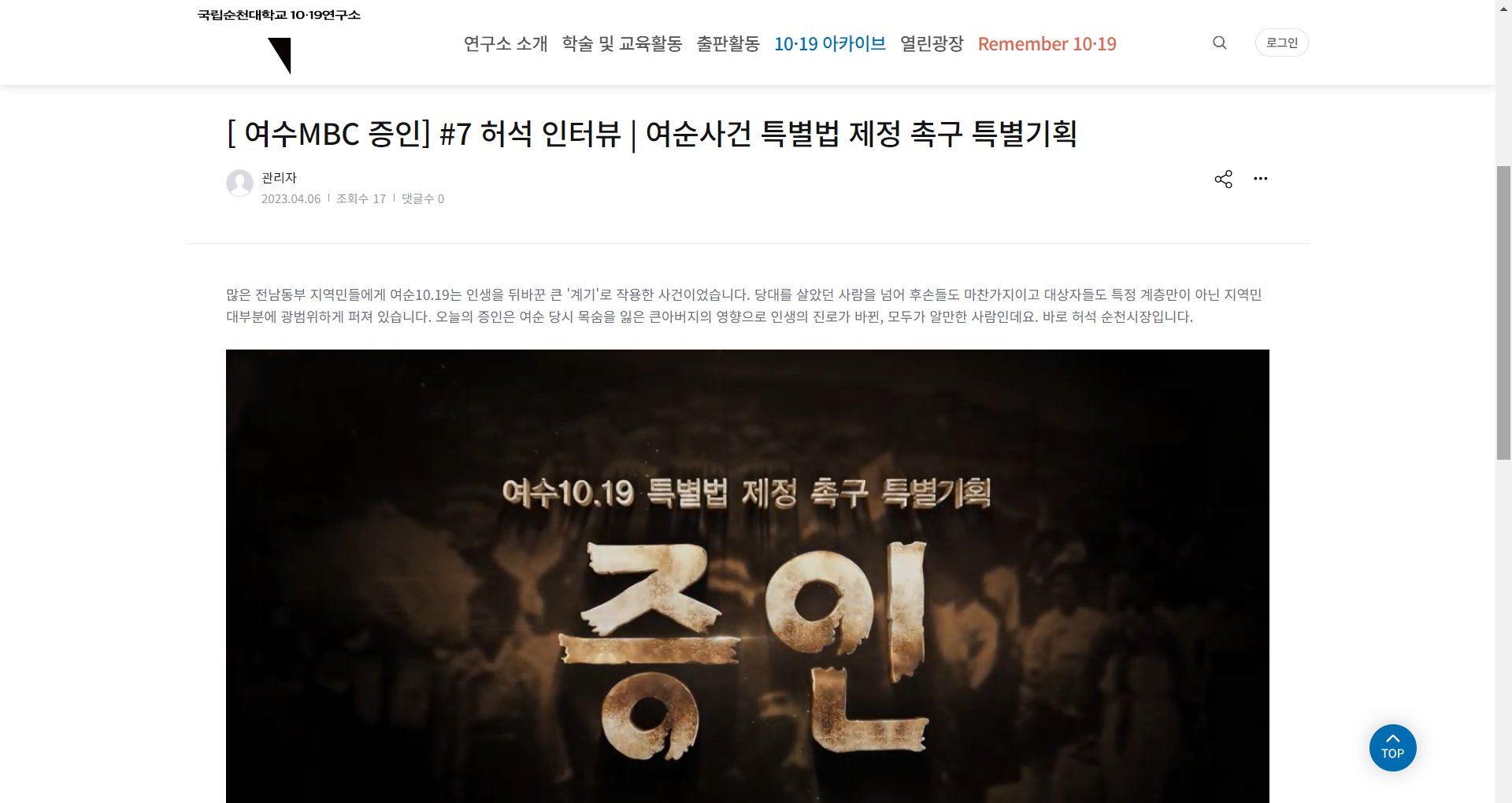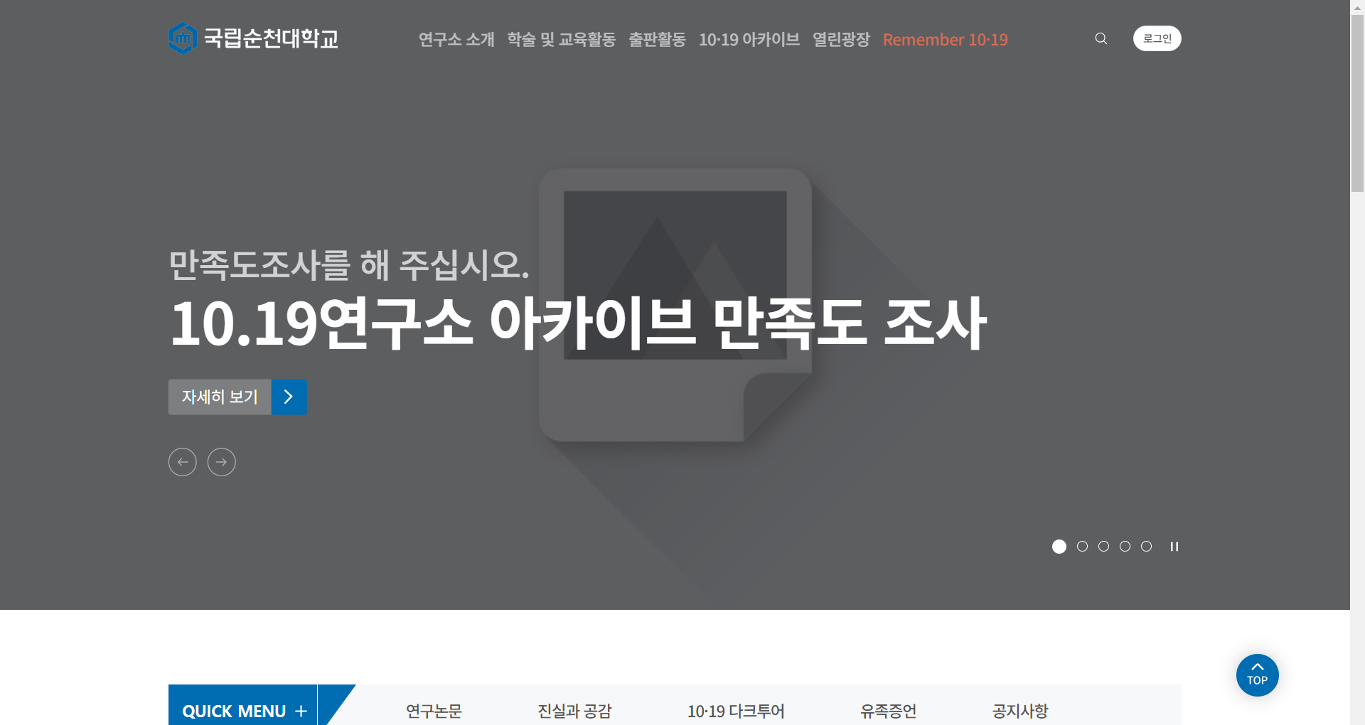 국립순천대학교 산하의 10·19 연구소에서 구축한 아카이브입니다. 2018년 4월에 여순연구소로 개소하였고 현재는 10·19 연구소로 명칭을 바꾸어 활동하고 있습니다. 2024년 2월 1일, 국립순천대 10·19연구소는 '여수/순천 10·19사건 진상규명, 희생자 명예회복에 관한 특별법' 시행 3주년을 맞아 10·19사건을 널리 알리고 관련 학문 후속세대와 신진 연구자 양성, 연구자들의 참여 증진을 목적으로 '아카이브'를 구축해 공개하였습니다. 10·19사건의 진실을 찾고 학살의 재발을 방지하고자 하며 연구소에서 진행한 학술 및 교육활동, 출판활동 및 여순사건 컬렉션을 보유하고 있으며 10·19연구소의 성과뿐만 아니라 10·19사건과 관련된 자료를 찾아볼 수 있습니다.