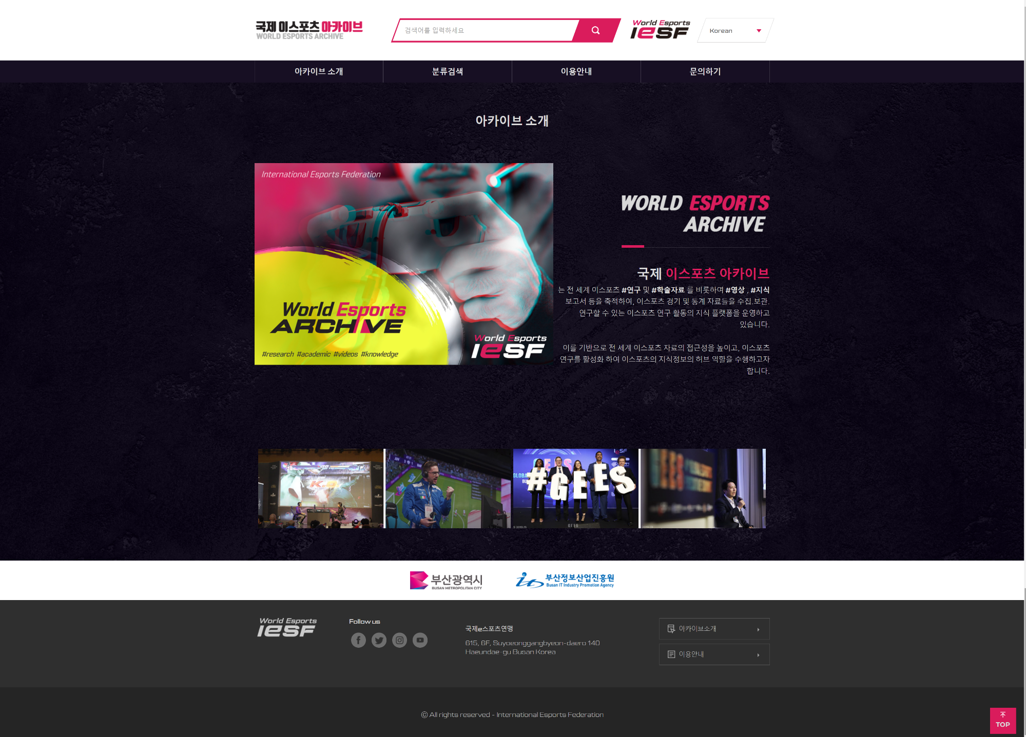 부산광역시와 부산정보산업진흥원에서 운영하는 국제이스포츠아카이브는 전 세계 이스포츠 연구 및 학술자료, 영상, 지식보고서를 수집하며 이스포츠 경기 및 통계자료들을 수집, 보관, 연구할 수 있는 이스포츠 연구 활동의 지식 플랫폼을 지향합니다. 리그오브레전드, 월드 챔피언십(IESF) 등의 연구보고서, 보도자료, 공식 행사, 학술대회 등의 이미지 및 영상, 문서를 제공하며 이용 시에 이용자 분석용으로 이용자 연령, 소속, 이용 목적에 관한 설문조사를 거치면 자유롭게 아카이브의 자료를 다운받을 수 있습니다.
