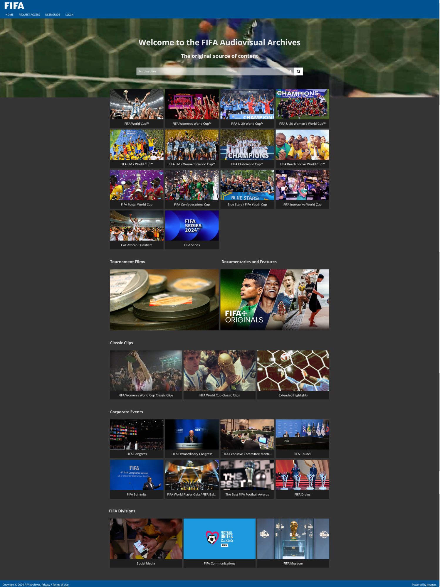 국제축구연맹(FIFA)에서는 축구를 통해 사회에 긍정적인 변화를 주고 사회적 책임을 다하기 위해 디지털 아카이브를 설립하였습니다. 평화롭고 포용적인 사회 증진을 위한 스포츠에 초점을 맞추고, 전세계와 축구로 커뮤니케이션 하고자 합니다. 월드컵 및 FIFA의 주요 경기의 라이브 방송과 경기 결과, 선수의 골 하이라이트, 부상 장면, 경기별 장면(순간)과 비하인드 스토리, 선수 개인의 이야기를 구분하여 컬렉션을 구성합니다. 피파 디지털 아카이브와 피파 오디오 아카이브도 함께 운영 중이지만, 이 두개의 아카이브는 회원가입 신청 및 접근권한 부여 신청 후 아카이브 이용이 가능합니다.