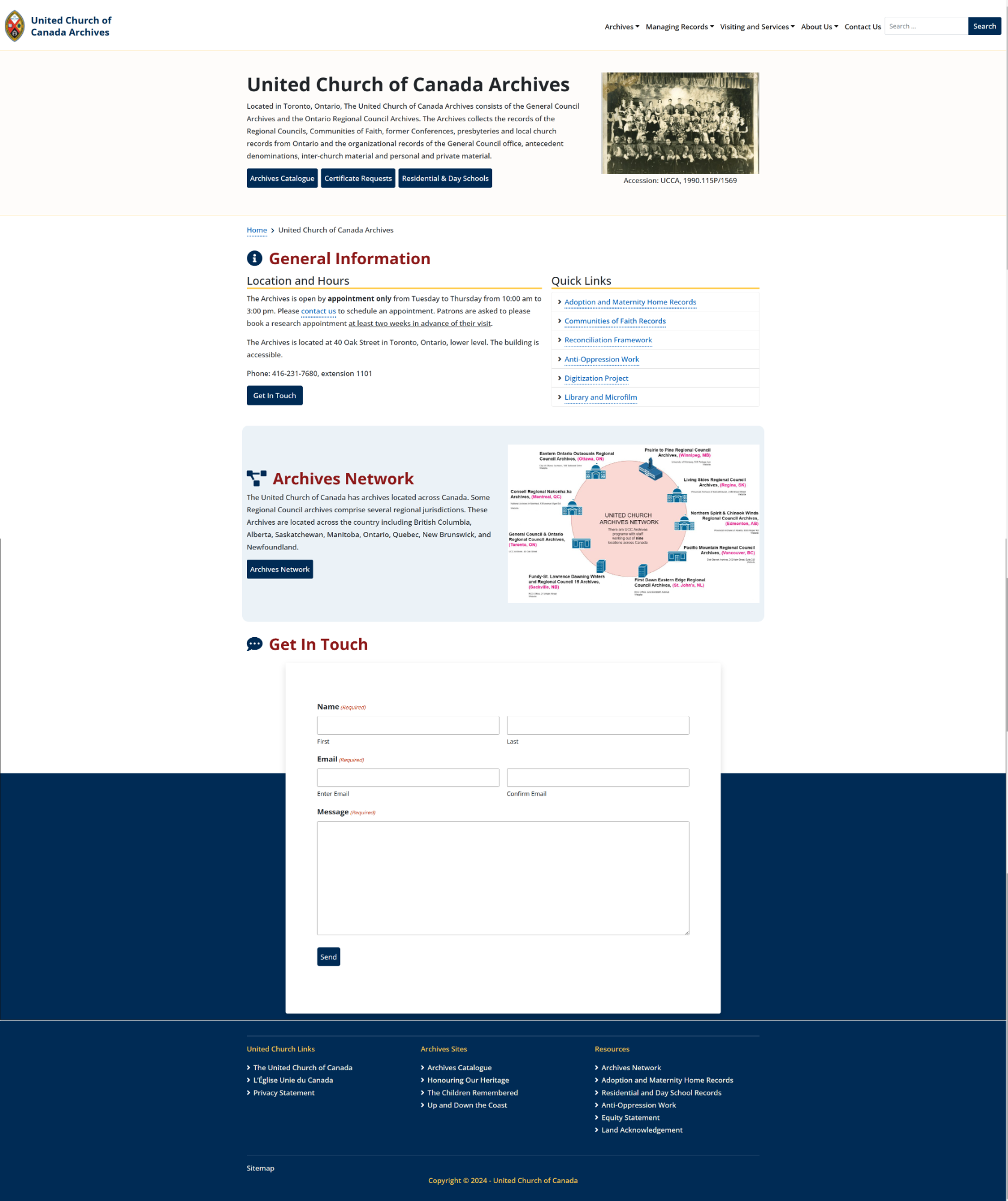 온타리오 주 토론토에 건물이 위치한 캐나다 연합 교회 기록 보관소는 총회 기록 보관소와 온타리오 지역 협의회 기록 보관소로 구성되어 있습니다. 기록 보관소는 지역 협의회, 신앙 공동체, 전 연회, 노회, 온타리오 지역 교회 기록의 기록과 총회 사무실, 선행 교단, 교회 간 자료, 개인 및 사적 자료의 조직 기록을 수집합니다. 1952년에 공식 출범한 캐나다 온타리오 지역 협의회 기록 보관소로 장로교, 감리교, 복음주의 등 여러 교단과 관련된 역사를 수집, 보존하여 제공합니다.