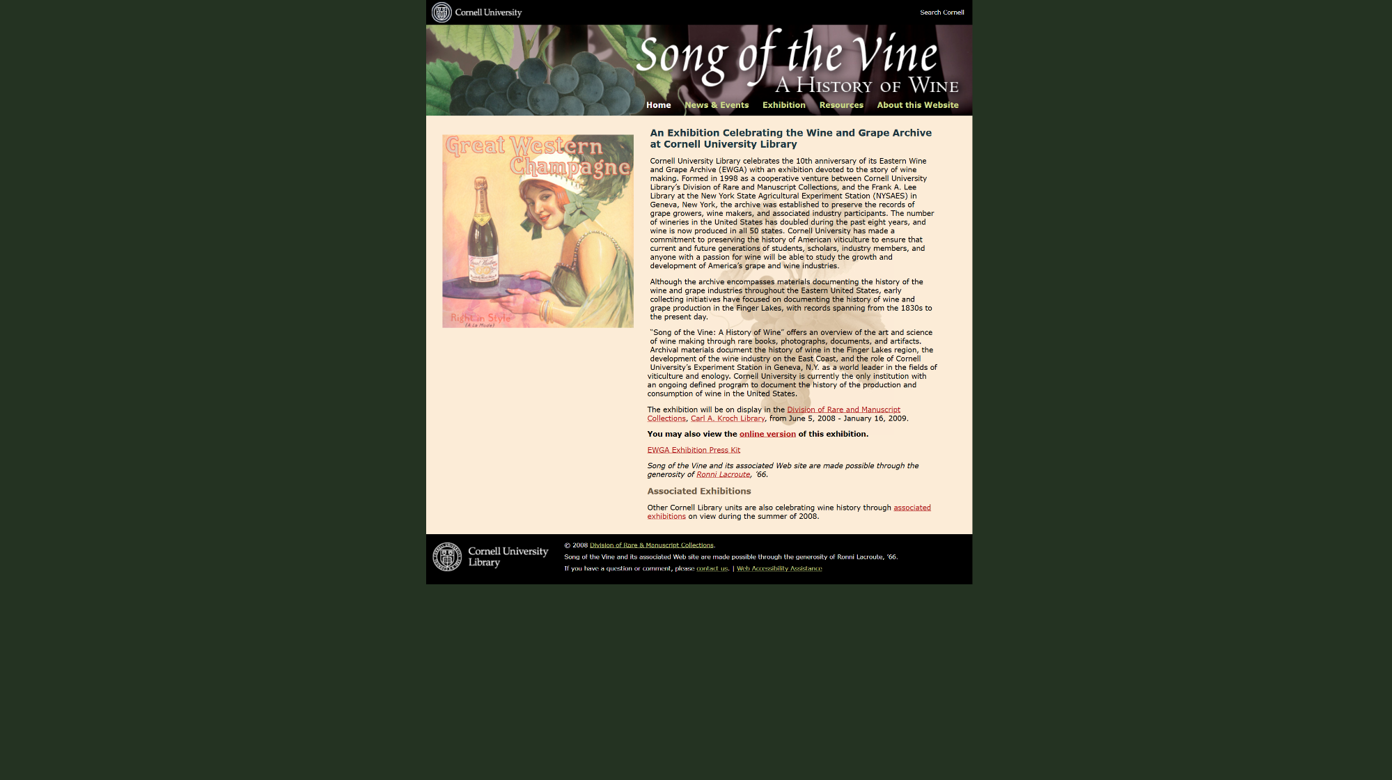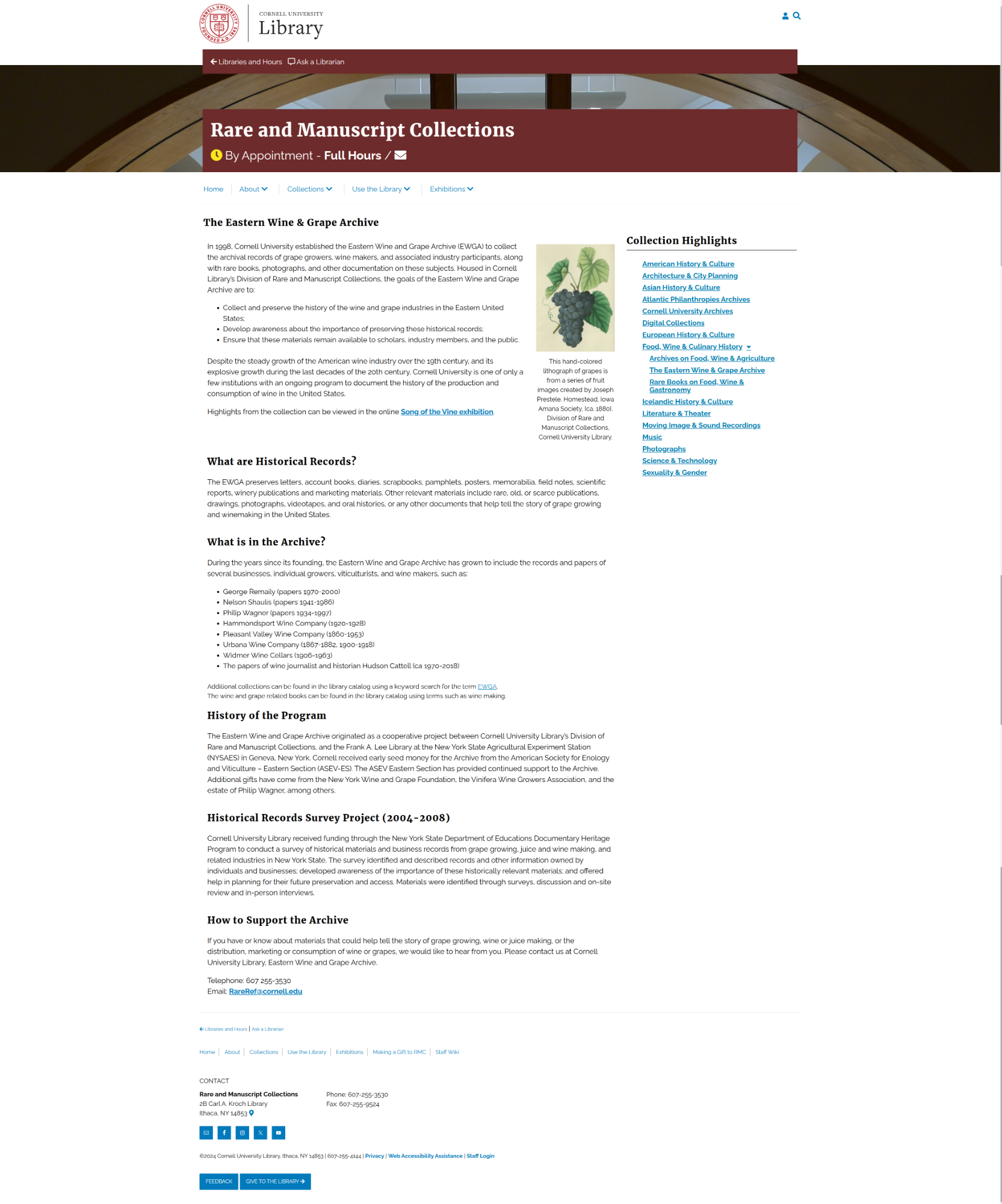 1998년, 코넬 대학교는 포도 재배자, 와인 메이커 및 관련 산업 참여자의 기록 보관 기록과 이러한 주제에 대한 희귀 도서, 사진 및 기타 문서를 수집하기 위해 Eastern Wine and Grape Archive(EWGA)를 설립했습니다. 디지털 아카이브 웹페이지는 2008년 오픈하였습니다. 코넬 도서관의 희귀 및 사본 컬렉션 부서에 보관된 Eastern Wine and Grape Archive의 목표는 다음과 같습니다. 미국 동부 지역의 와인과 포도 산업의 역사를 수집하고 보존합니다.