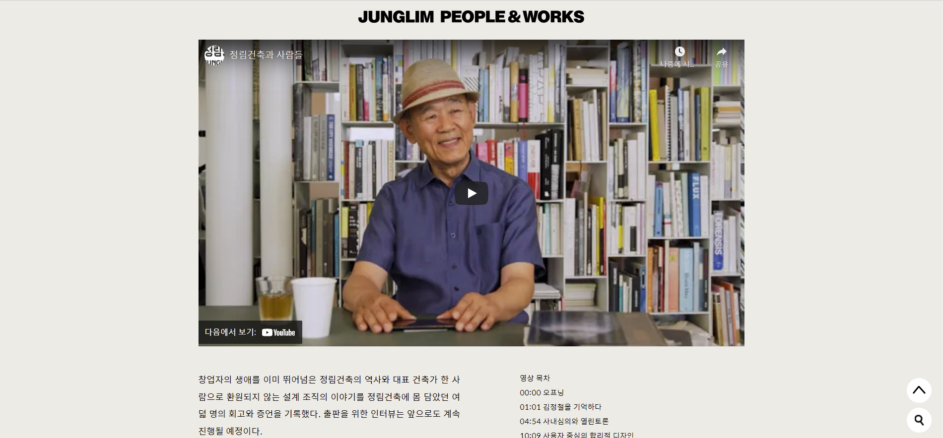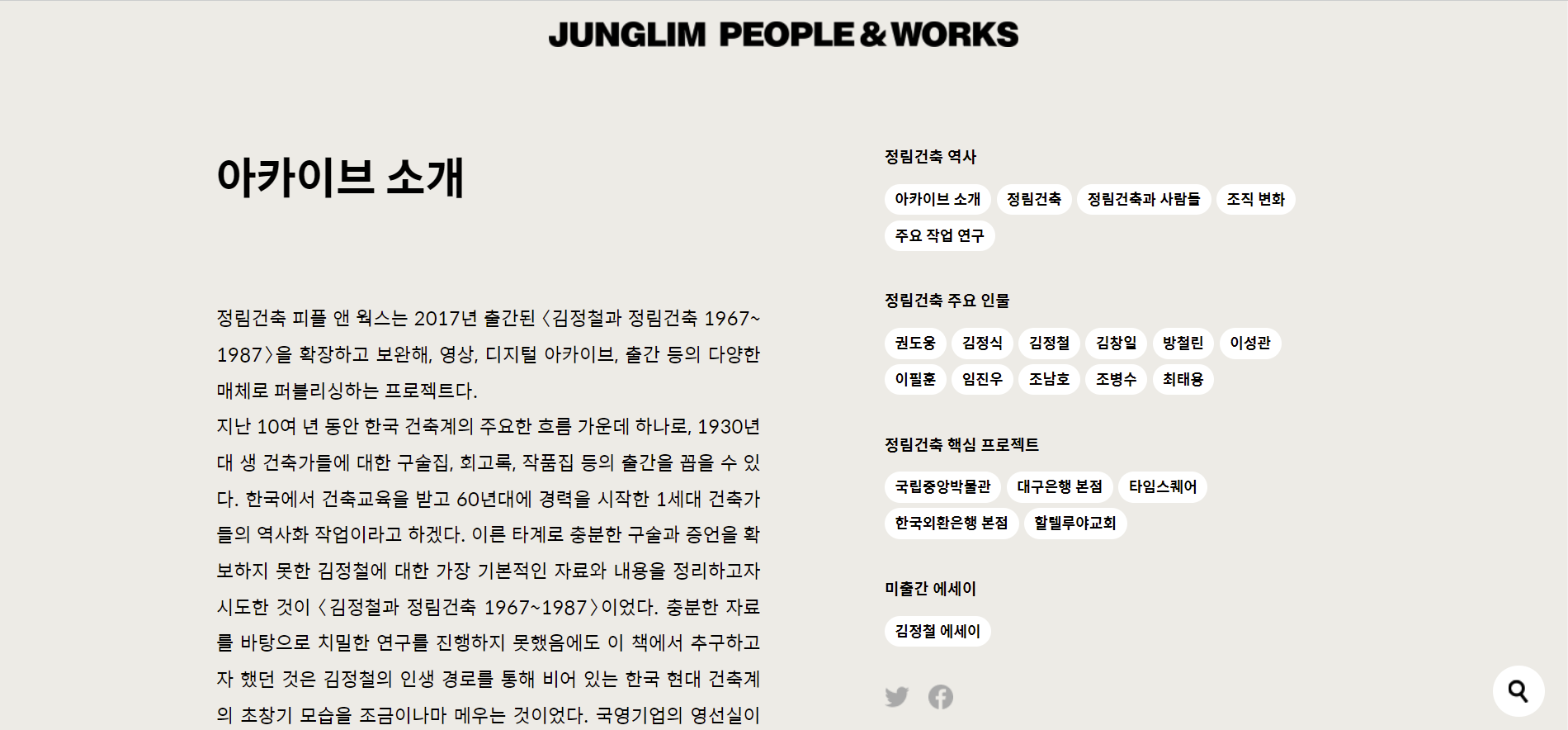 | 변경전 내용 | 정림건축 피플 앤 웍스는 2017년 출간된 <김정철과 정림건축 1967~1987>을 확장하고 보완해, 영상, 디지털 아카이브, 출간 등의 다양한 매체로 퍼블리싱하는 프로젝트다. 지난 10여 년 동안 한국 건축계의 주요한 흐름 가운데 하나로, 1930년대 생 건축가들에 대한 구술집, 회고록, 작품집 등의 출간을 꼽을 수 있다. 한국에서 건축교육을 받고 60년대에 경력을 시작한 1세대 건축가들의 역사화 작업이라고 하겠다. 이른 타계로 충분한 구술과 |