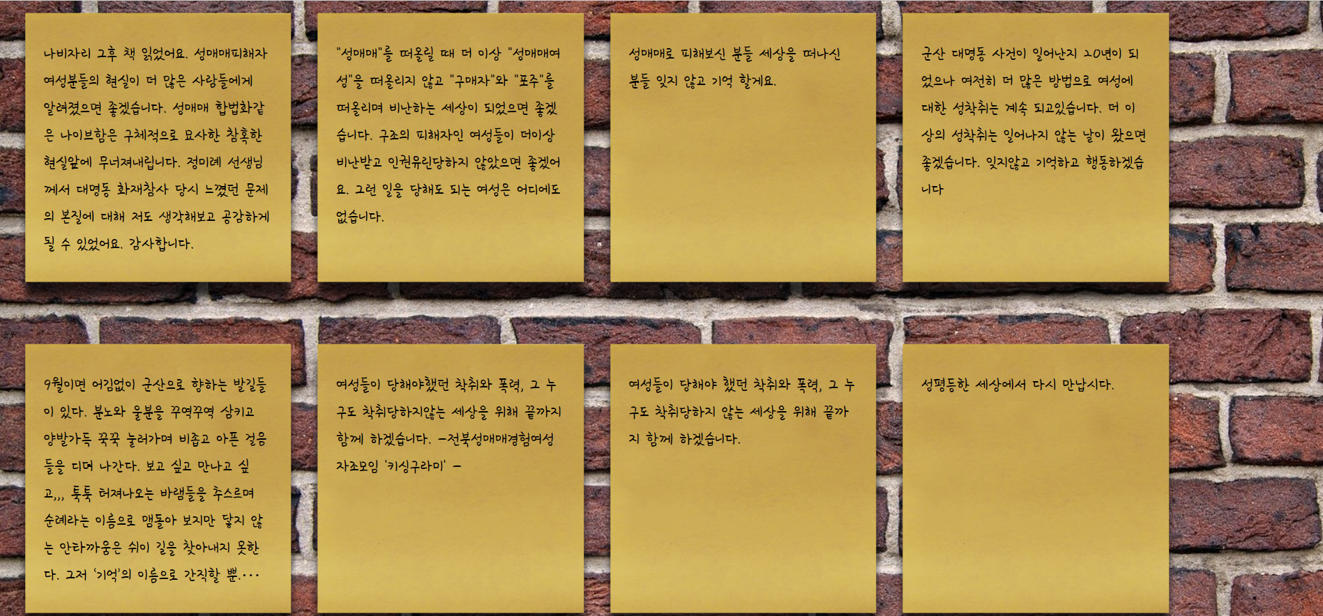 는 한국 사회가 성매매를 다루어 온 역사와 성매매여성 인권의 위치를 조명하고자 합니다. 2000년, 2002년 군산 성매매 업소에서 연달아 발생한 화재로 19명의 여성이 목숨을 잃었습니다. 그러나 20여 년이 지난 지금도 성매매여성의 인권은 전혀 달라지지 않았습니다.