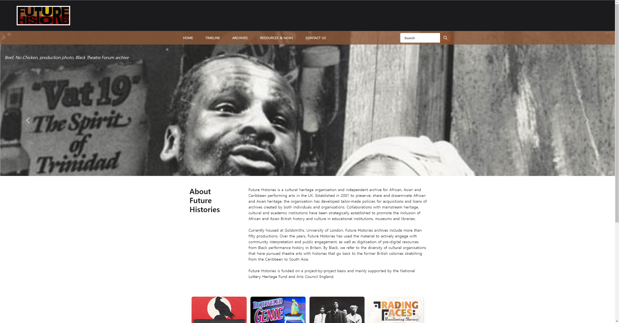 Future Histories is a cultural heritage organisation and independent archive for African, Asian and Caribbean performing arts in the UK. Established in 2001 to preserve, share and disseminate African and Asian heritage, the organisation has developed tailor-made policies for acquisitions and loans of archives created by both individuals and organisations. Collaborations with mainstream heritage, cultural and academic institutions have been strategically established to promote the inclusion of African and Asian British history and culture in educational institutions, museums and libraries.