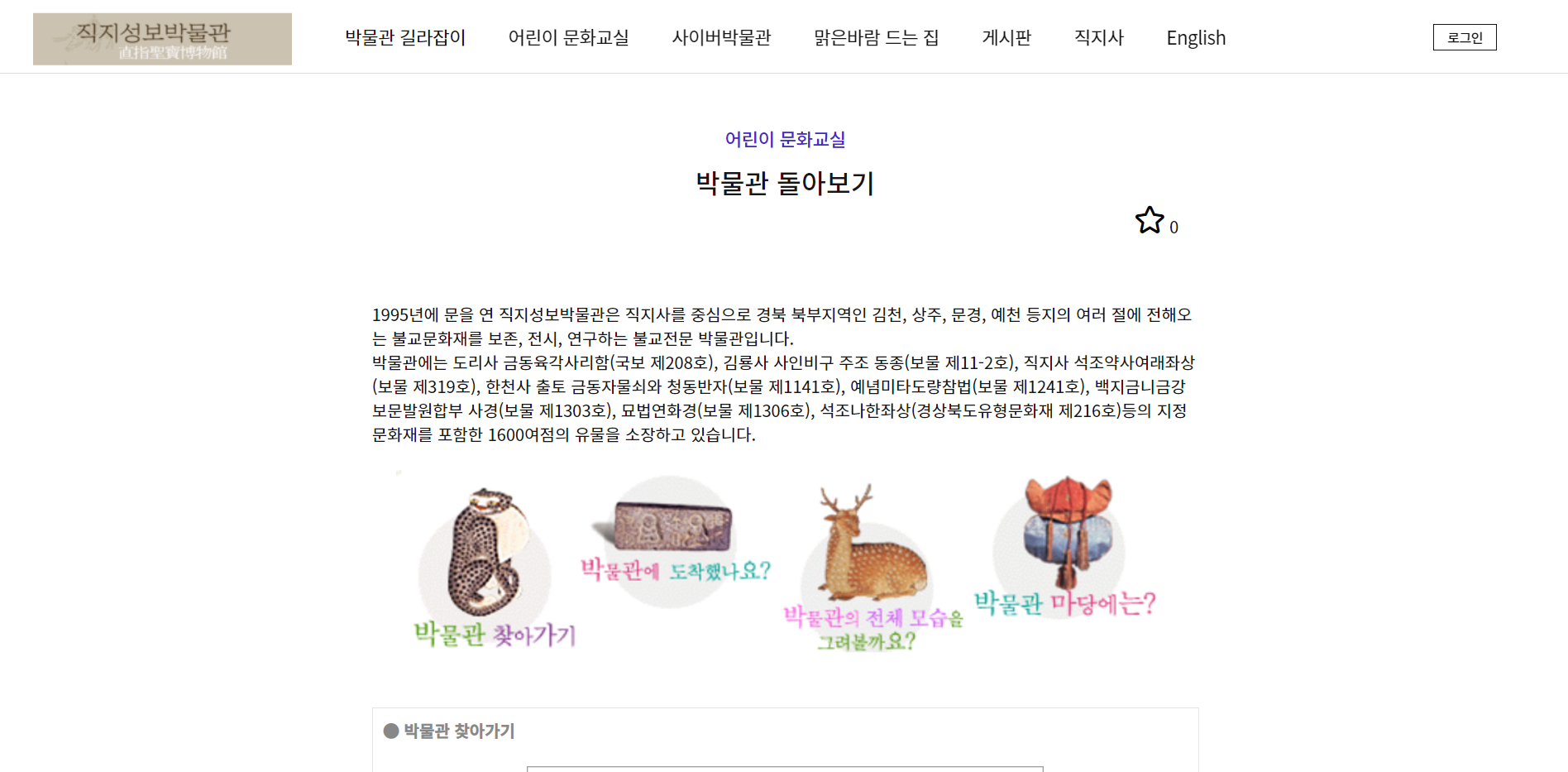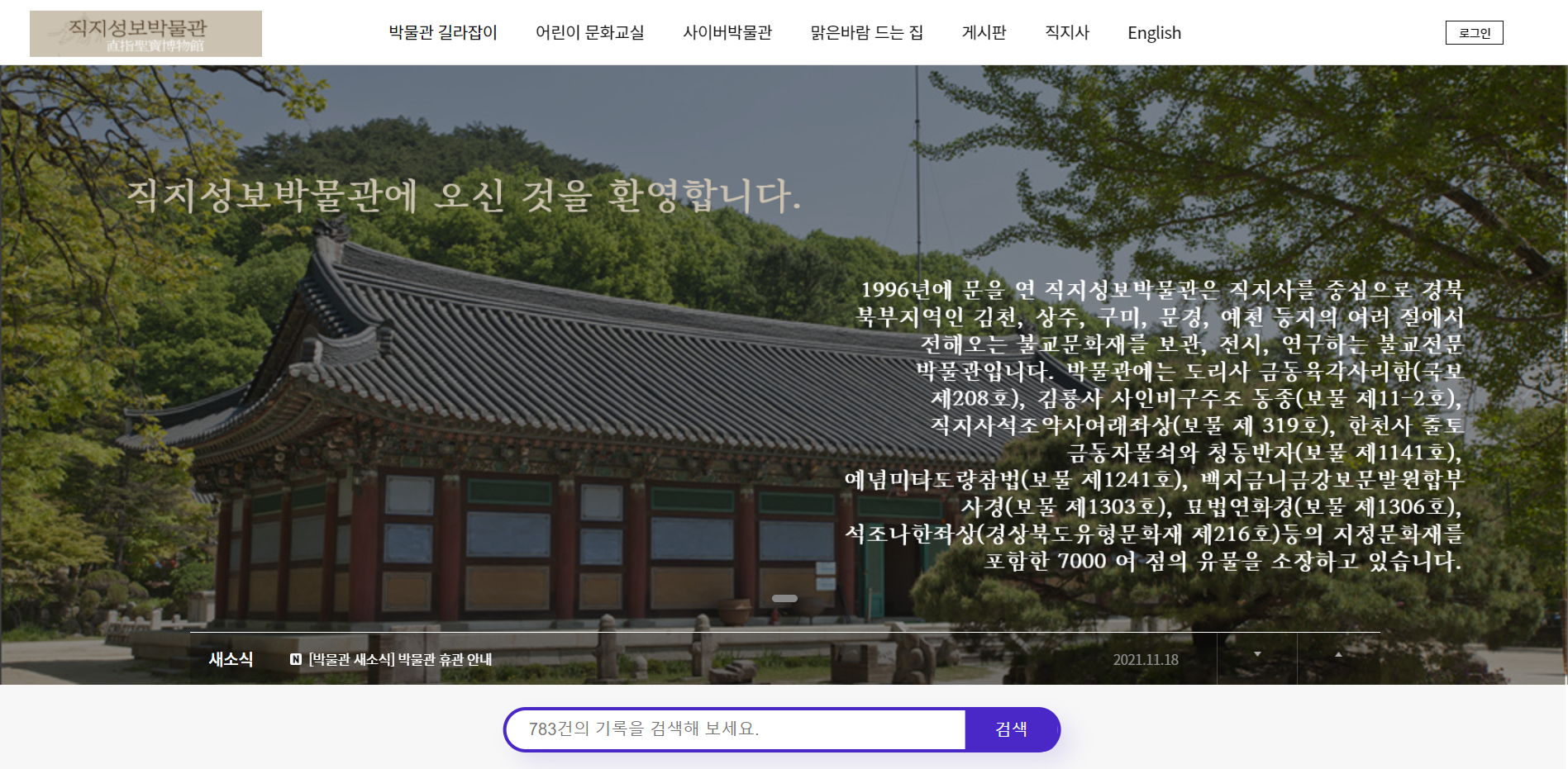 "1996년에 문을 연 직지성보박물관은 직지사를 중심으로 경북 북부지역인 김천, 상주, 구미, 문경, 예천 등지의 여러 절에서 전해오는 불교문화재를 보관, 전시, 연구하는 불교전문 박물관입니다.
