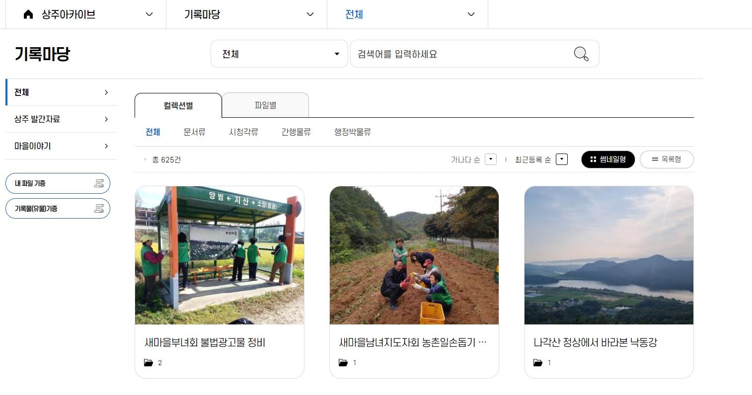 기록마당에서는 상주시와 상주문화원에서 생산한 발간자료와 읍면동 단위 마을 기록이 제공되며, 마을 이야기 콘텐츠를 함께 제공한다.