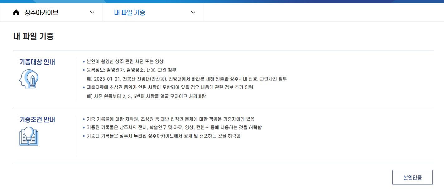 내 파일 기증은 휴대전화 등 디지털기기로 촬영한 자료를 기증하고, 기록물(우물) 기증은 고문서와 고서적 등을 기증 신청하는 기능이다. 기록물 기증 건에 대해서는 상주박물관과 함께 기증 및 기탁 절차를 밟게 된다.
