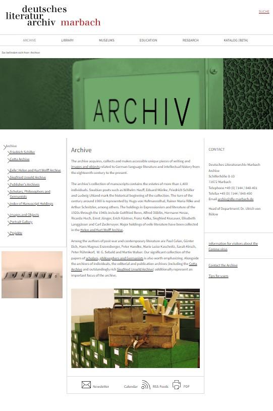 "독일 문학 아카이브(Deutsches Literaturarchiv – DLA)는 세계에서 가장 중요한 문학 기관 중 하나입니다. 이 컬렉션은 1750년부터 현재까지의 문학 및 지적 역사에 대한 귀중한 자료를 풍부하게 모아 보존하고 있습니다. 1955년 설립 이후 문학, 교육 , 연구 활동을 펼쳐왔습니다. 컬렉션은 자료 비평을 수행하는 모든 사람에게 열려 있습니다.